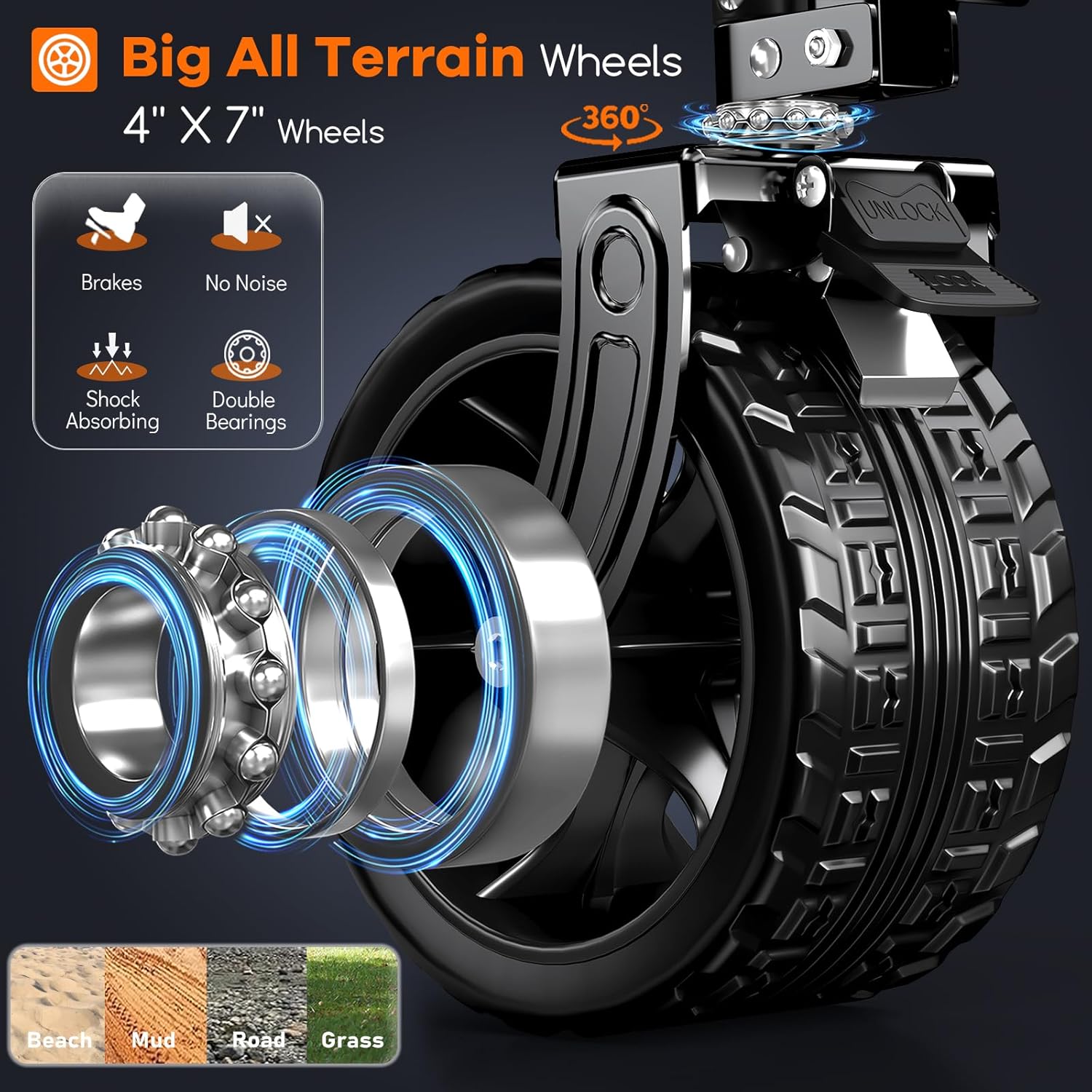 - ใ๐ฏ๐ฒ๐ฌยฐ๐ฅ๐ผ๐๐ฎ๐๐ถ๐ผ๐ป ๐จ๐ป๐ถ๐๐ฒ๐ฟ๐๐ฎ๐น ๐๐น๐น-๐๐ฒ๐ฟ๐ฟ๐ฎ๐ถ๐ป ๐๐ถ๐ด ๐ช๐ต๐ฒ๐ฒ๐น๐ ๐๐ถ๐๐ต ๐๐ฟ๐ฎ๐ธ๐ฒ๐, ๐ฆ๐๐ถ๐๐ฎ๐ฏ๐น๐ฒ ๐ณ๐ผ๐ฟ ๐ฉ๐ฎ๐ฟ๐ถ๐ผ๐๐ ๐ฅ๐ผ๐ฎ๐ฑ ๐ฆ๐๐ฟ๐ณ๐ฎ๐ฐ๐ฒ๐ใThis beach carts features 4 larger and wider 7"x4" double bearings all-terrain big wheels, allowing for flexible steering and smooth rolling on various road surfaces such as mud, grass, and hard sand. The two 360ยฐ rotation front wheels with brakes, effectively to stop and prevent the wagon from moving. It' s shock-absorption and noise-reduction, ensuring durability and resistance to wear and tear.