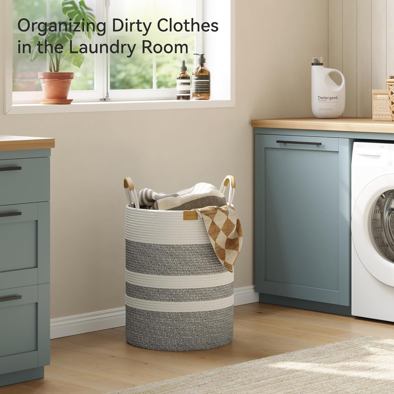 62L Striped Laundry Hamper with Leather Handles,Large Foldable Laundry Basket for Clothes,Cotton Rope Storage Bin for Blankets,Woven Clothes Basket for Bedroom,Gray Stripes
