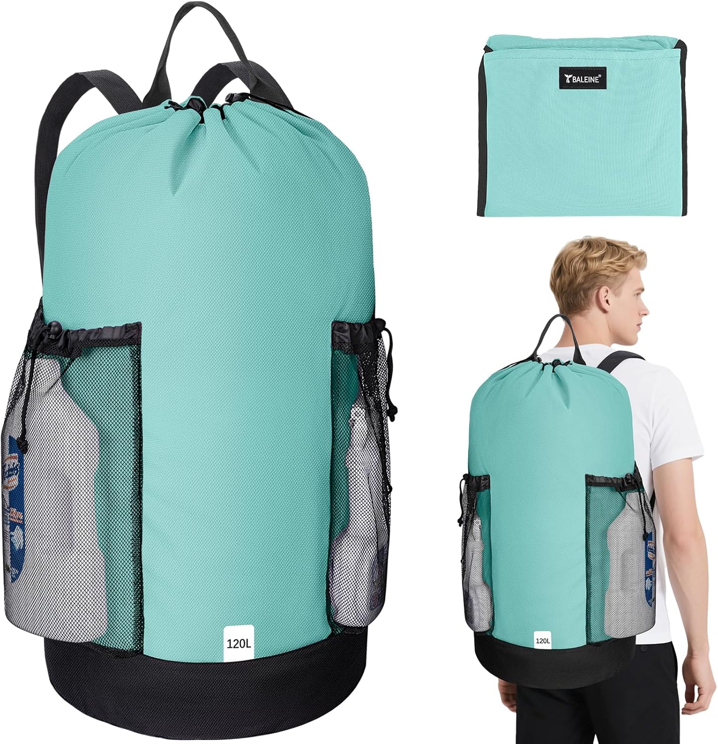 BALEINE 120L Laundry Bag Backpack, 900D Oxford Fabric Large Travel Laundry Bags with Shoulder Straps and 2 Mesh Pockets for College Dorm, Apartment, Laundromat (Sky Blue, 120L)