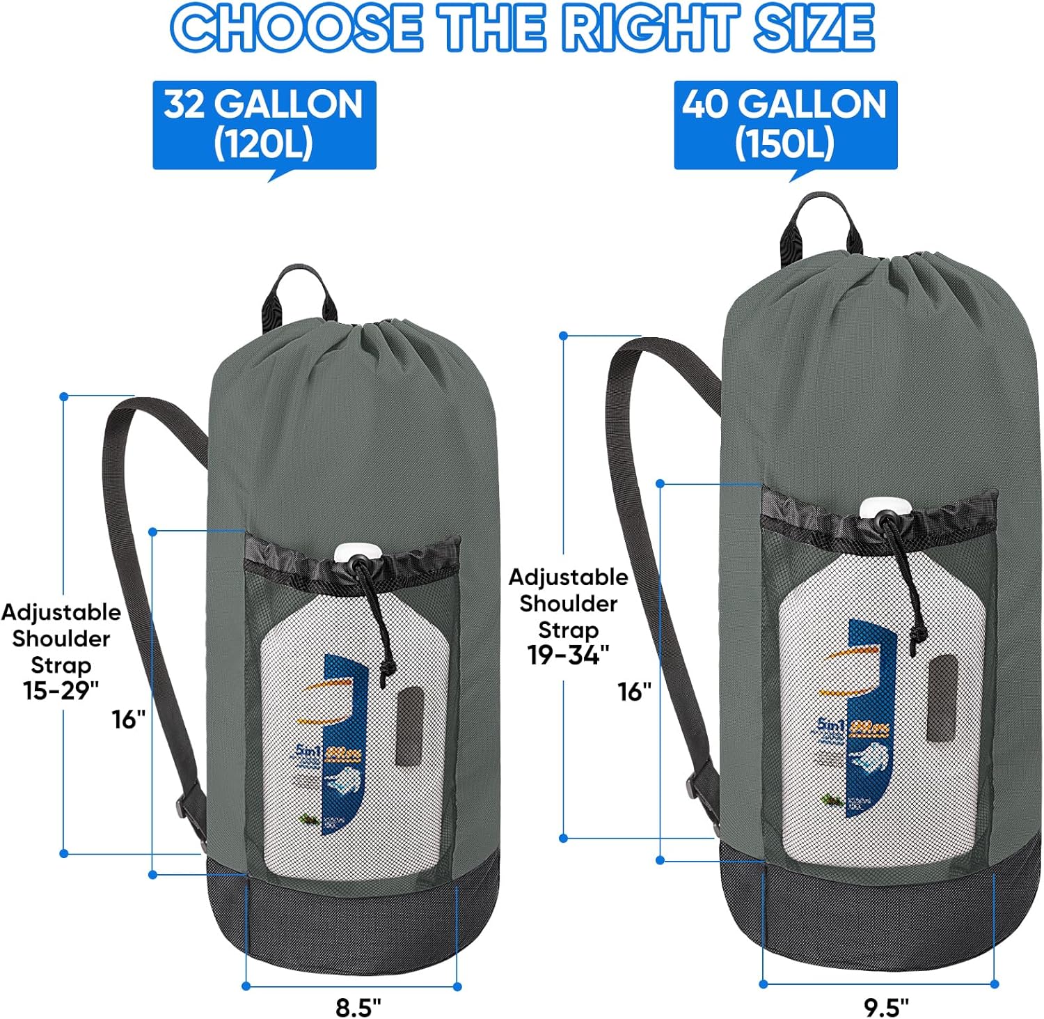 - 150L Large Laundry Bag: These travel laundry bags measure 32 "H X 16 "L with a large capacity of up to 150 L, enough for holding 2-3 batches of clothes; They also feature two front mesh wash pockets (16 "H X 8.5"L each), making your laundry backpack have space for storing detergent, shoes, and other essentials