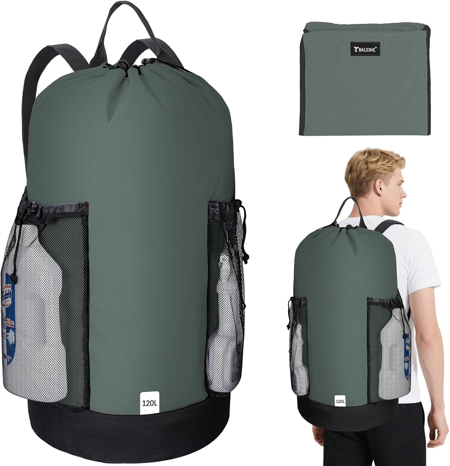 BALEINE 120L Laundry Bag Backpack, 900D Oxford Fabric Large Travel Laundry Bags with Shoulder Straps and 2 Mesh Pockets for College Dorm, Apartment, Laundromat (Dark Grey, 120L)