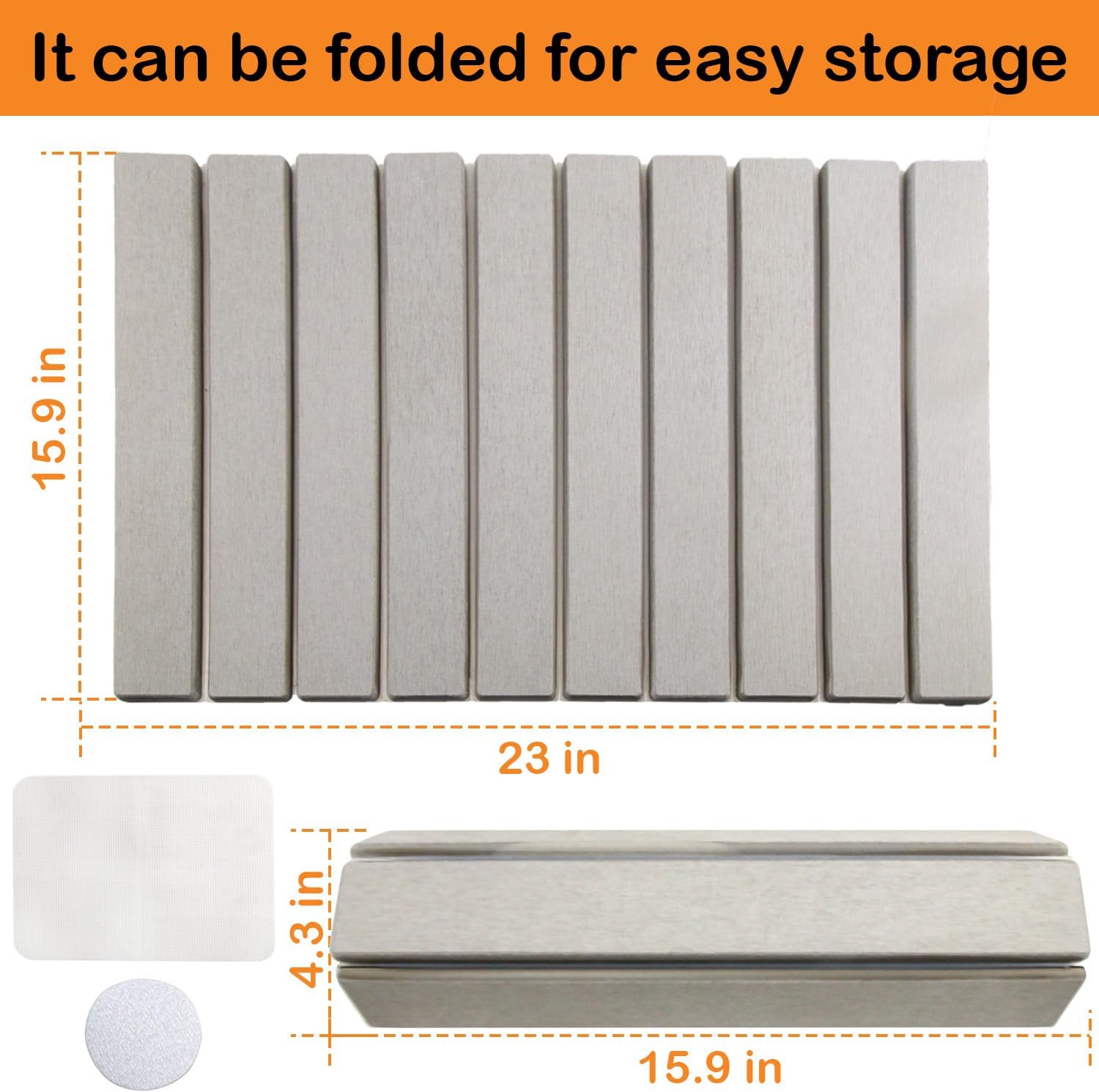 - Effortlessly dry dishes, wine glasses, bottles, or bulky cookware on this generously sized 23" x 16" mat. When done, fold it down to a compact 16" x 5" for tidy storage in drawers or under sinks—perfect for small kitchens or on-the-go use during camping trips.
