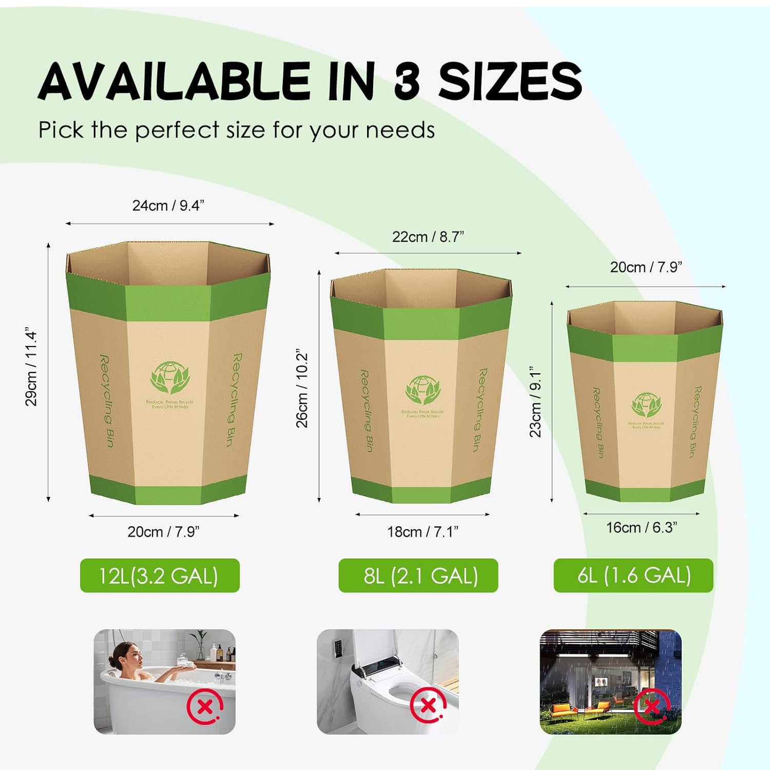 - 6-Pack Value – Choose from 3 Sizes: Each pack includes 6 recycling bins of the same size. Available in 12L (3.2 gal), 8L (2.1 gal), or 6L (1.6 gal) capacities to suit different usage needs. Compact, foldable, and easy to transport or store—these bins provide a smart and eco-conscious waste management option for any setting.