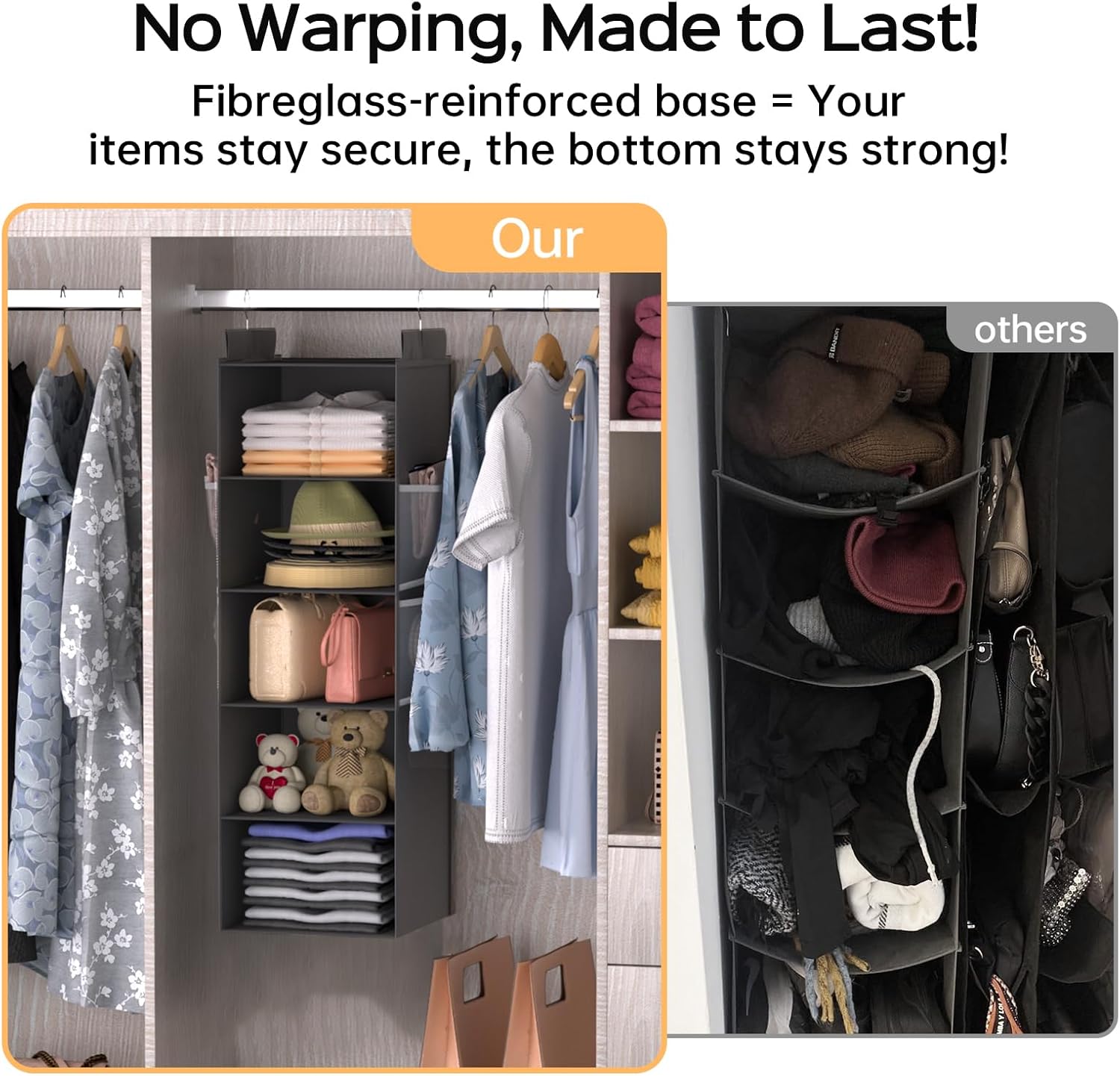 Deep Hanging Closet Organizers and Storage, Closet Hanging Storage Shelves with 5 Shelves and 4 Mesh Pockets, Heavy-Duty Closet Organizer for Clothes, Hats, and RVs and Dorm Essential,1-Pack, Grey