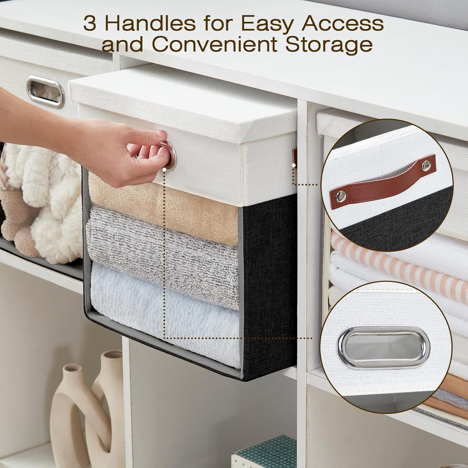 - Sturdy 3 Handles: Our clear cube storage bins upgraded to 3 handles, the sturdy PU handles easy-to-grab handles make carrying simple and allow easy access to bins, even from high places. A front metal handle has also been added, making pulling and moving the storage organizer from closets, under beds, and bookshelves easy and effortless.