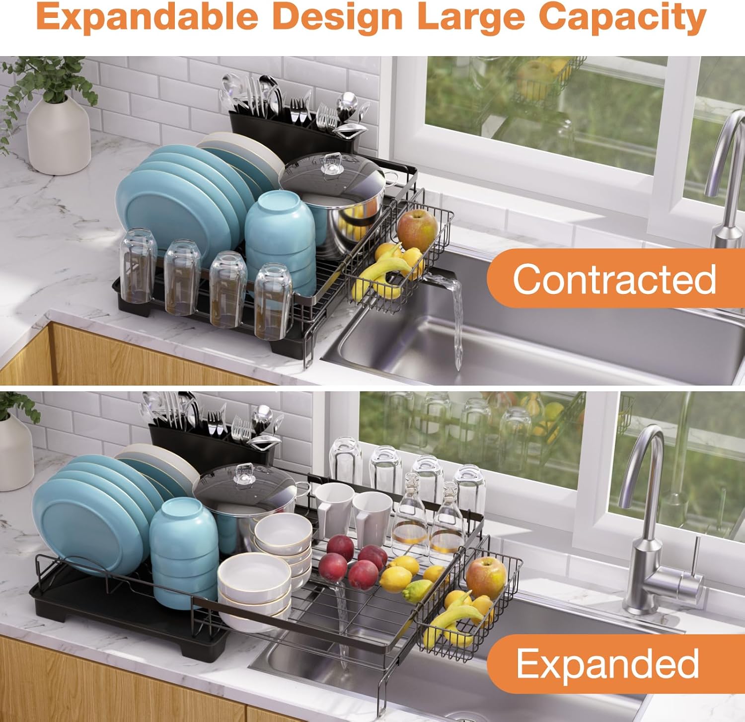- Extendable & Spacious Design: Our dish drying rack adopts an extendable design, expanding from 22.6" (57.5cm) in length to fit your kitchen needs. With a generous 16.5" (42cm) width and 4.3" (11cm) height, this multifunctional dish rack provides ample space for cups, bowls, plates and pans.