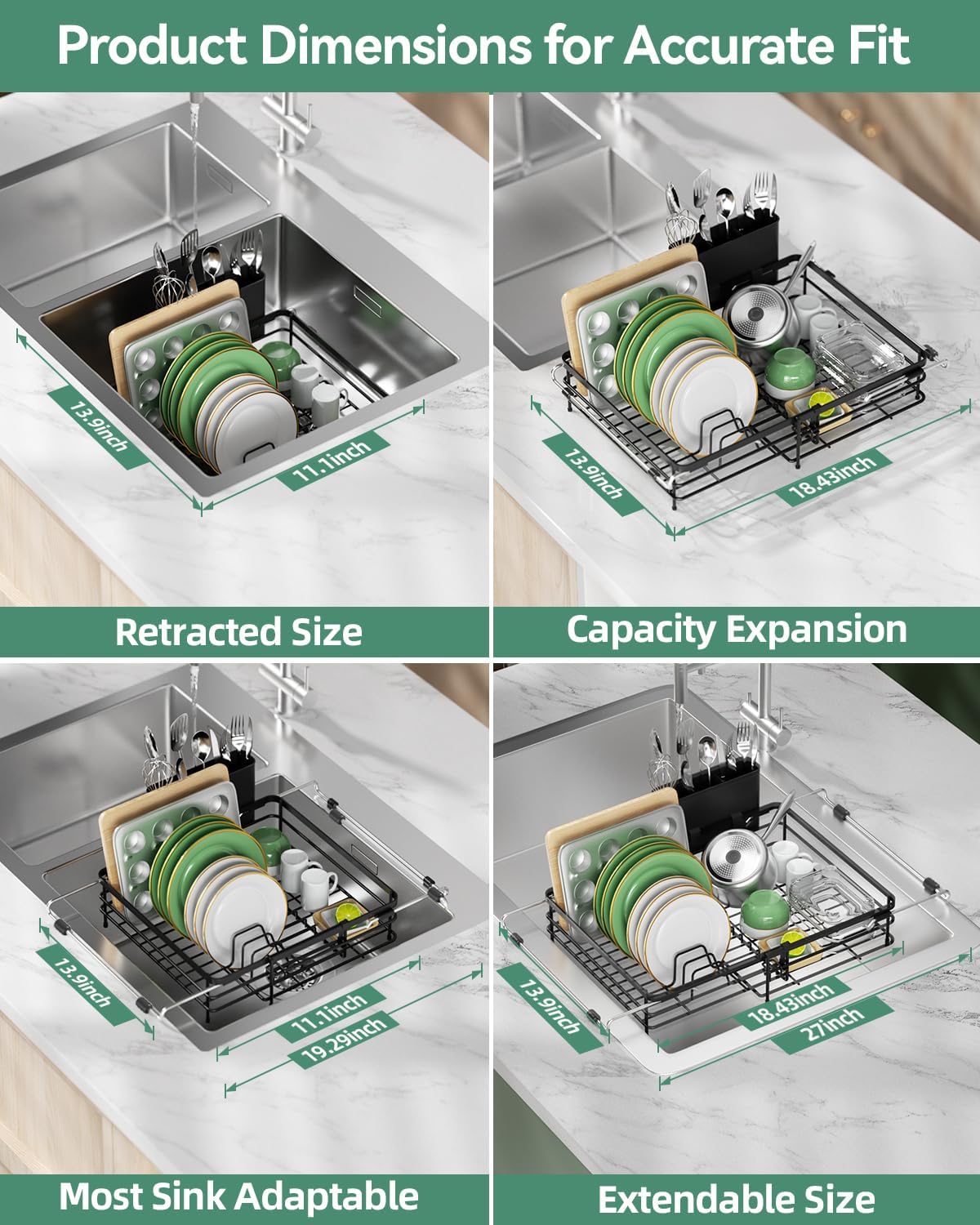 Expandable in Sink Dish Drying Rack - Adjustable Capacity (11.1''-18.43 ''L) Over Sink Dish Drainer Drying Rack for Kitchen Counter, Dish Rack with Utensil Holder