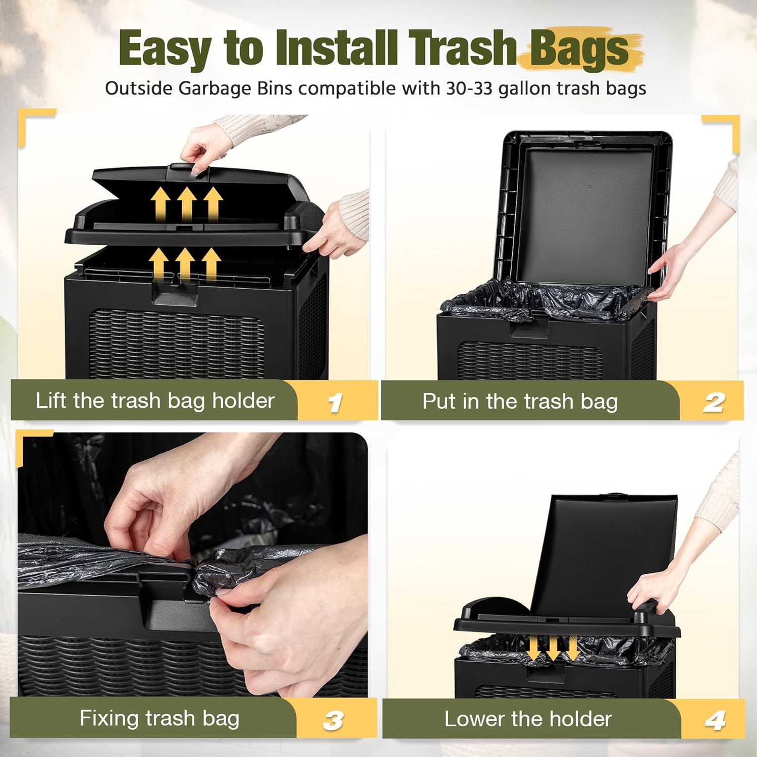 - Smart Dual Lid Design: This trash can designed with Innovative dual lid hides trash bags for a tidy yard, the outer lid opens and closes easily with one hand and keeps out odors, the inner lid stabilizes trash bags in place