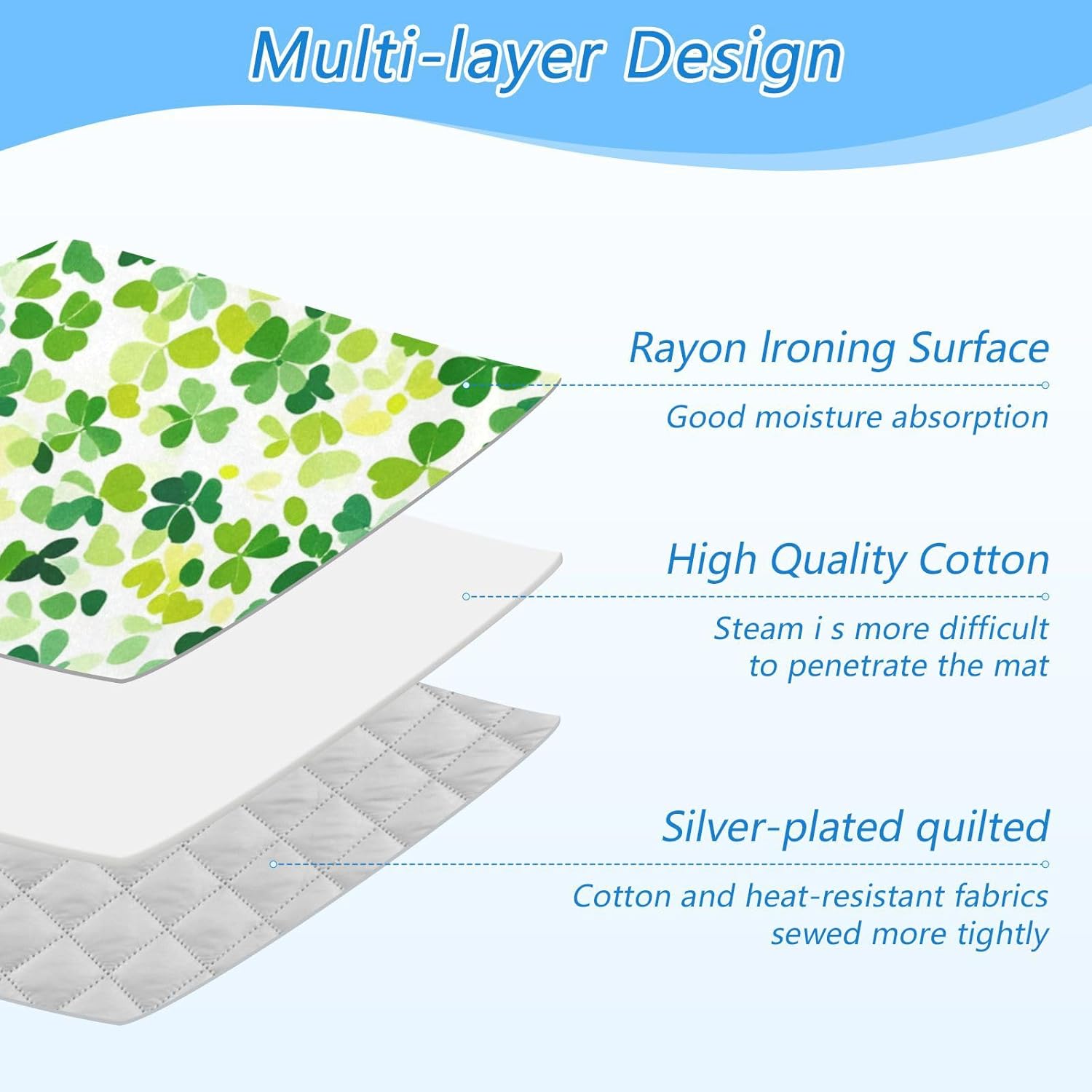 - High Quality:This ironing mat adopts a multi-layer design, with a surface made of Rayon lroning and good moisture absorption. High quality cotton in the middle makes it Steam more difficultto penetrate the mat. The bottom layer is coated with 210 silver-plated quilted, with cotton and heat-resistant fabricssewed more tightly. The ironing pad can be used on both sides, making it more durable