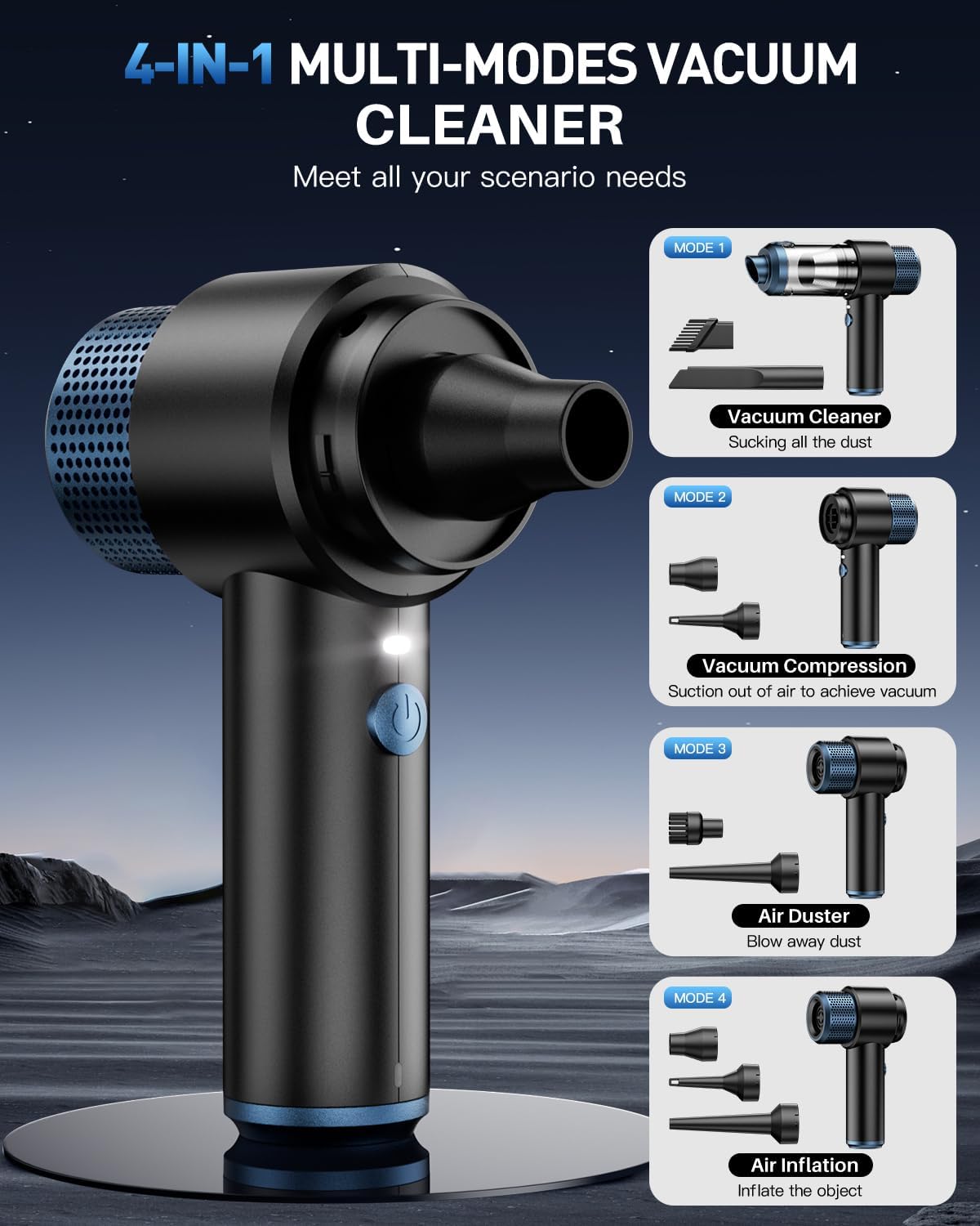 - 💠【4-IN-1 Car Vacuum Cleaner】Handheld Vacuum cleaner used with 7 accessories can be used to get 4 modes of suction, blowing, inflation and vacuum compression to meet your different use scenarios. Floor brush and nozzle brush can easily suck up all kinds of debris. Blowing nozzle can be used to blow away dust from keyboards and narrow crevices. Two sizes of universal nozzles can quickly inflate or expel air from objects such as swimming rings, mattresses, etc