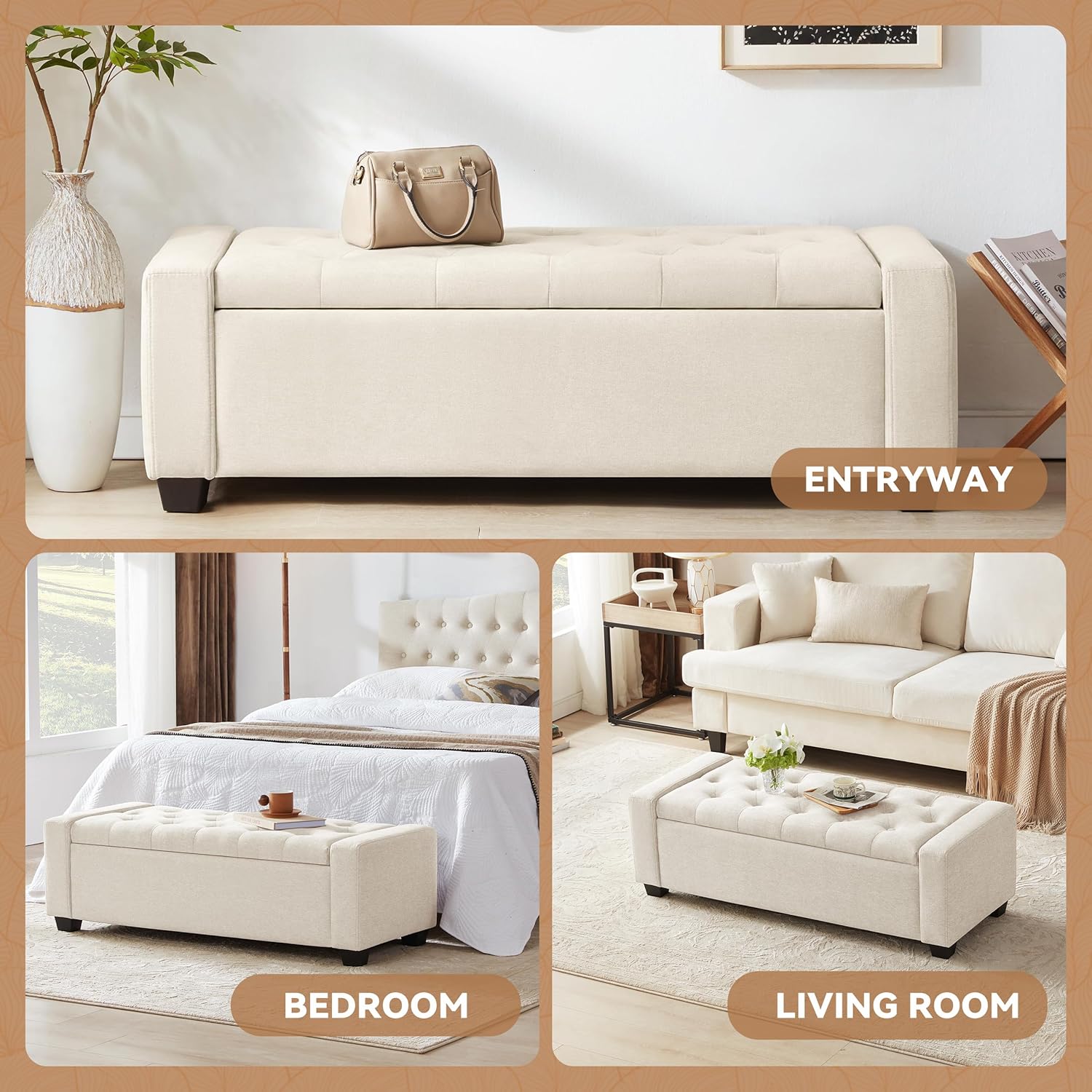- Multi-Functional for Various Spaces: Suitable for bedrooms, living rooms, entryways, or dressing areas. Functions as an end of bed storage bench, shoe bench, footrest, window seat, or storage chest—delivering strong practicality in one piece
