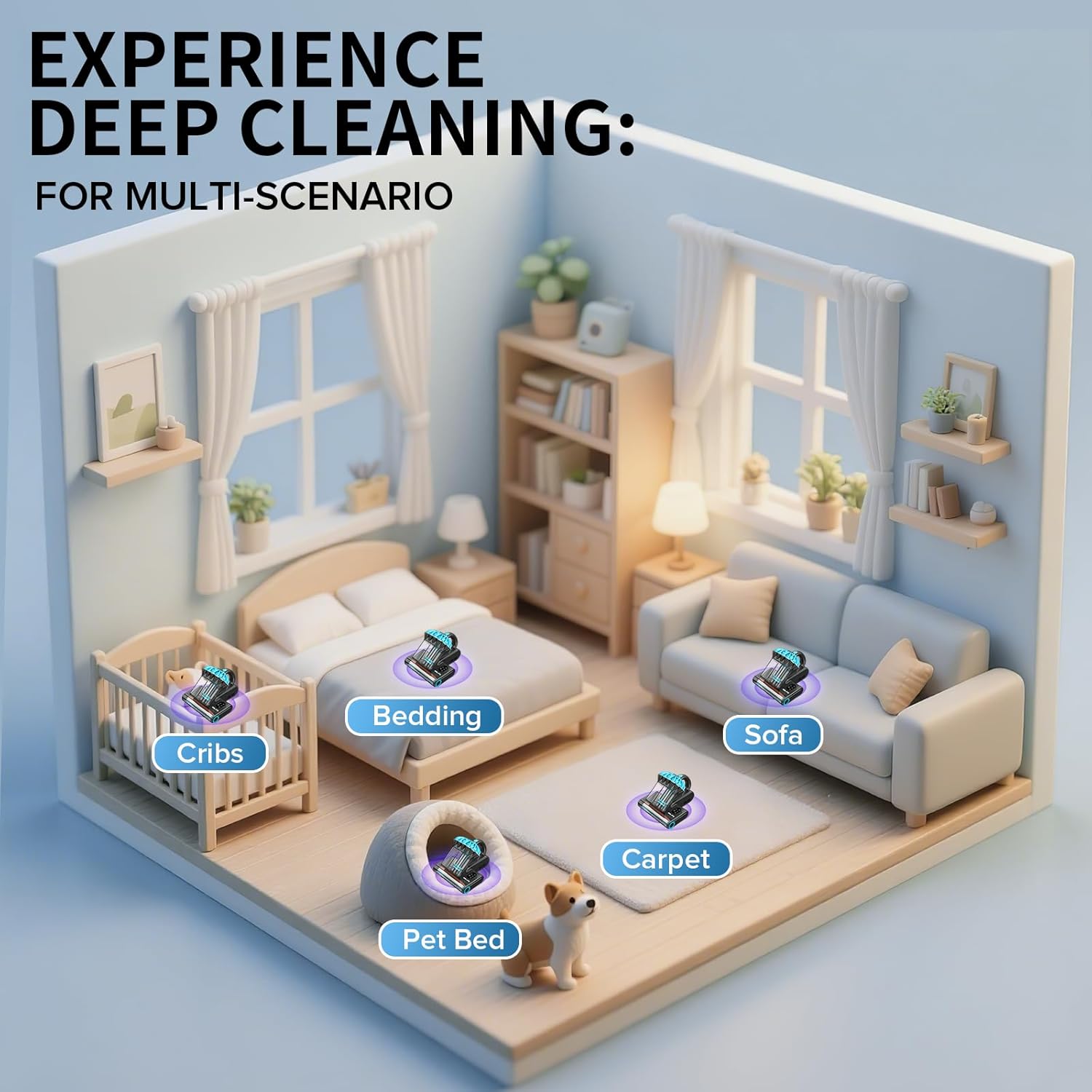 - 3-IN-1 Deep Cleaning: Equipped with 253.7nm u-v, 140Β°F (60β) hot air, and a high-frequency rotating brush, our vacuum targets dust, pet dander, and debris from mattresses, sofas, baby cribs, pet beds, and carpets. Perfect for homes with pets or babies. Note: UV activates only when the machine touches the mattress directly; lifting it pauses UV instantly