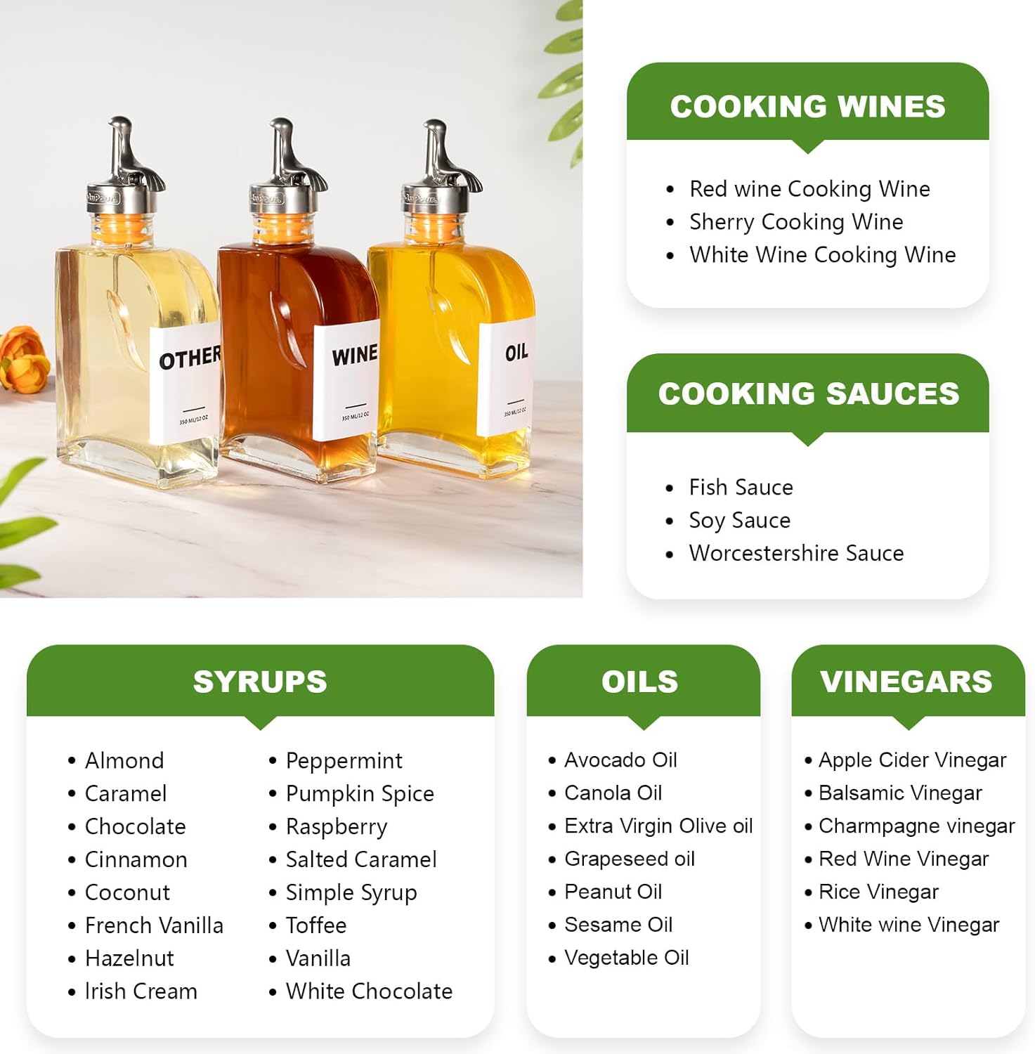 - Versatile and Elegant: Oil bottle dispenser and lid have good leakproof and airtight effects. This glass bottle dispenser can be used to hold cooking oil, vinegar, soy sauce, cooking wine, coconut milk, vegetable oil, balsamic vinegar and more