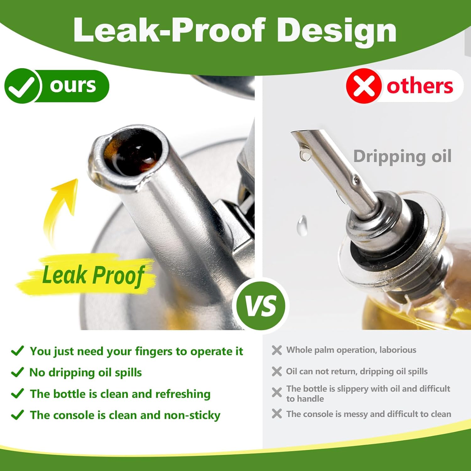 - Leak Proof Spout: This oil dispenser is designed with stainless steel pour spouts, sealed cap and flap cap that prevents oil from leaking and also keeps dust from contaminating the liquid. Keep your olive oil fresh