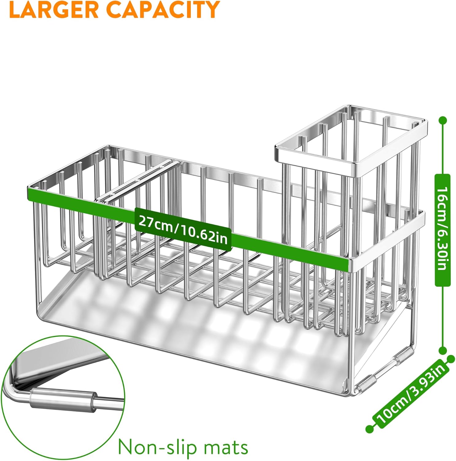 - 【EXTENDED AND LARGER CAPACITY】Cisily sponge holder has upgraded size. The size is only 10.62 inches * 3.97 inches * 6.37 inches, which can accommodate detergent bottles, sponge balls and sink plugs. Cisily sink organizer is additionally upgraded with a brush holder, which can hold up to 4 large and small brushes, perfectly saving countertop space.