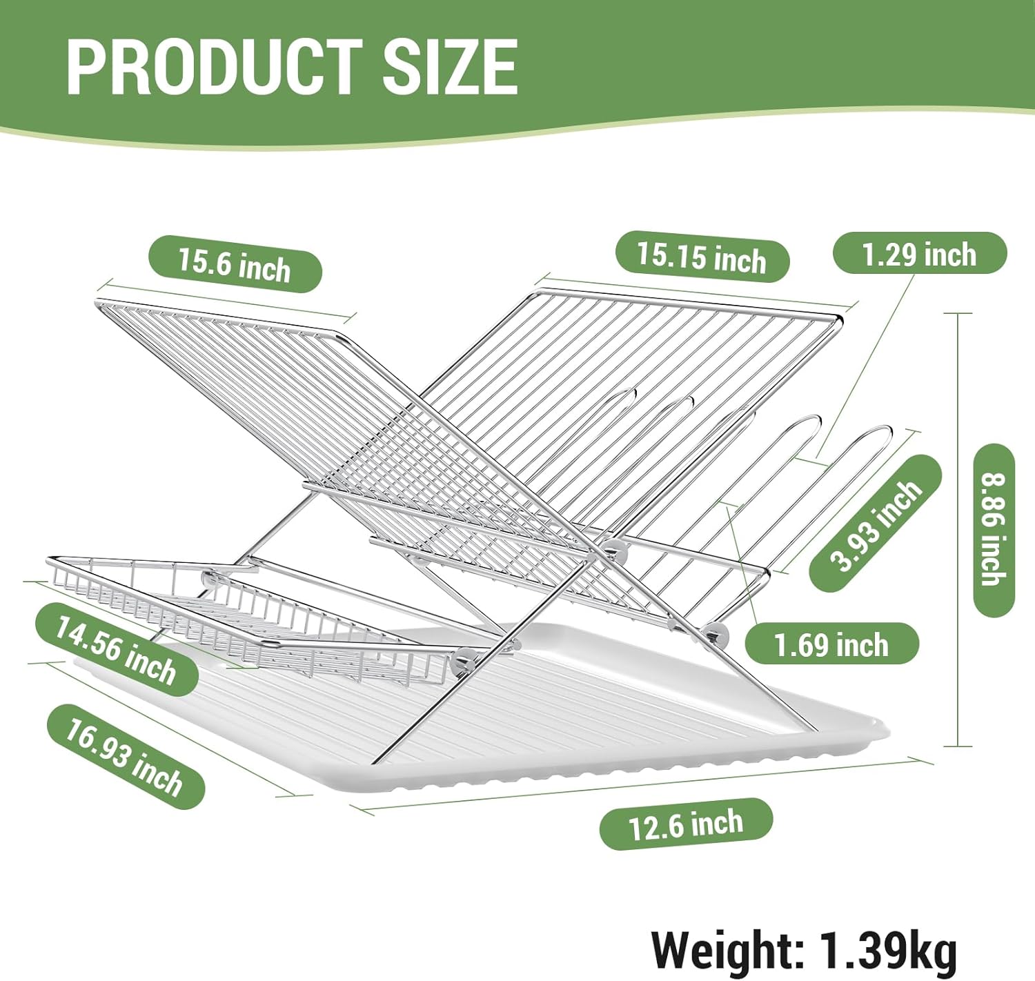 Dish Rack with Drip Tray, Stainless Steel 3-Tier Collapsible Drainer Dish Drying Rack for Kitchen Counter, Sink, Countertop,Cutlery, Dishes Utensils Flatware Holder Set, Reversible Cup Draining Rack