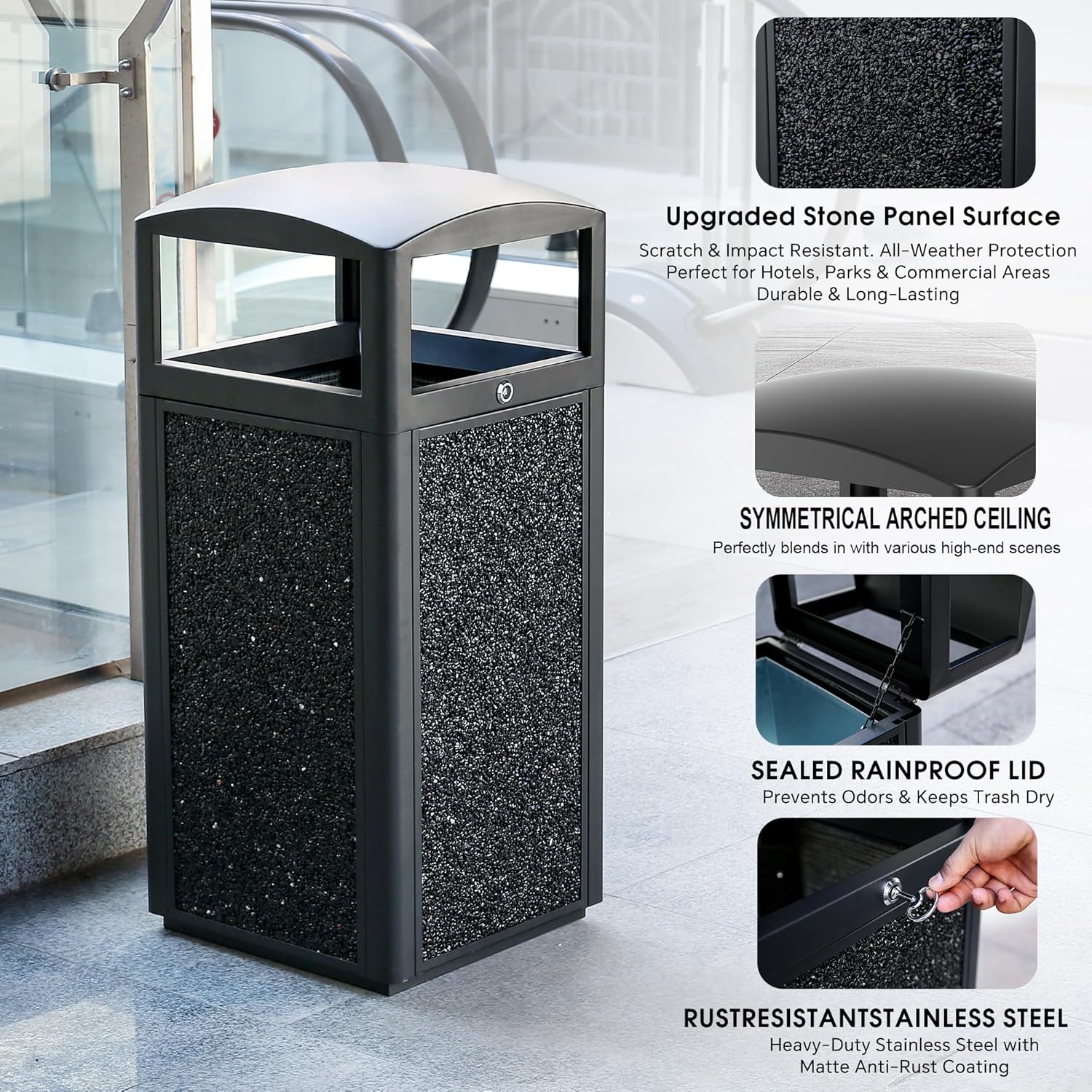Commercial Metal Outdoor Trash Can with Lid, Lockable Outdoor Garbage Can with Nature Stone Panels, Heavy-Duty Rustproof Trash Bin with Removable Liner for Parks & Public Spaces