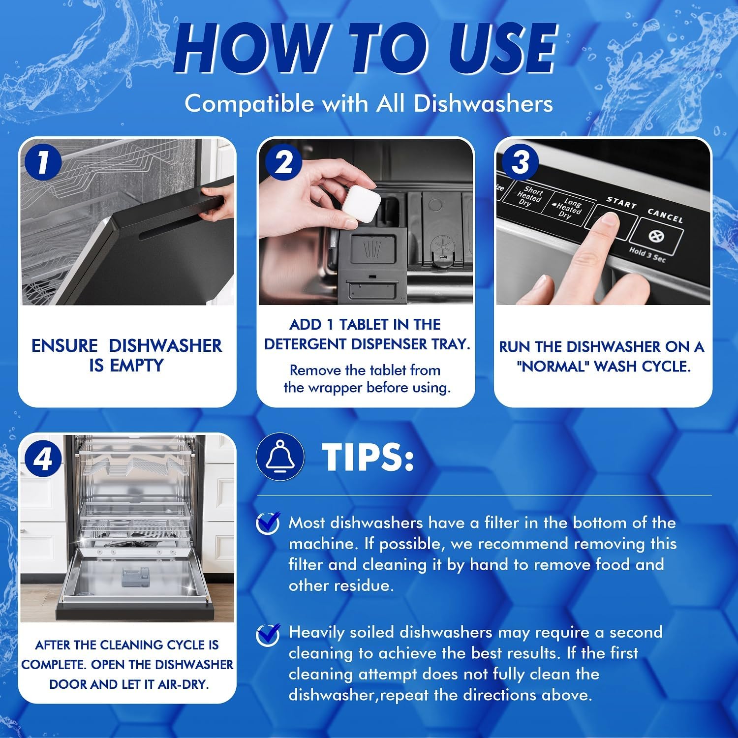 - Annihilate nasty limescale, grease, and grime hiding in jets & filters! Our dishwasher cleaner tablets unleash a citric acid storm to dissolve buildup FAST. Restore water flow + get dishes sparkling again!