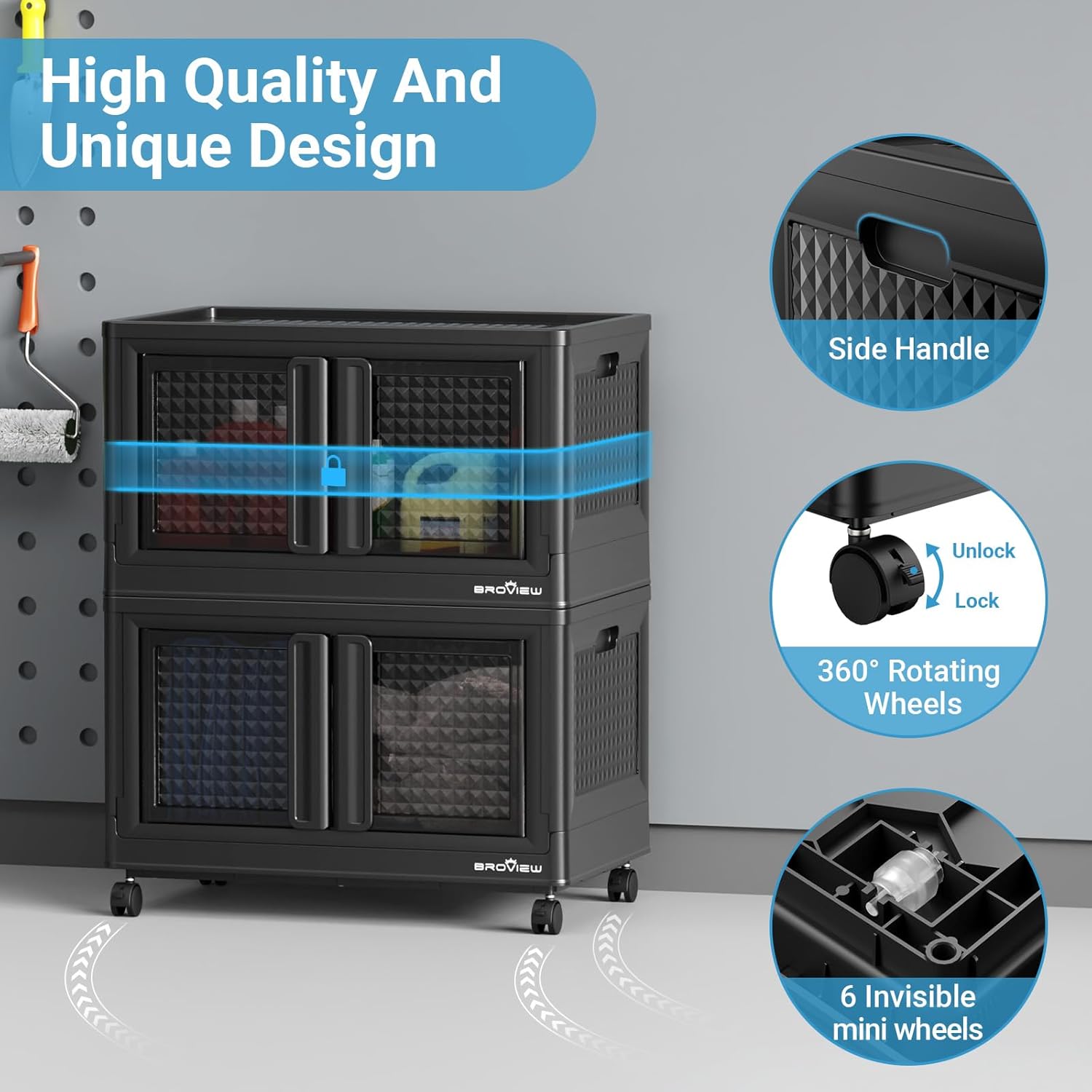 BROVIEW 600 Qt Stackable Storage Bins with Lids & Doors, 6 Pack Plastic Closet Organizer and Storage Drawers with Wheels, Large Collapsible Storage Boxes, Cabinet for Home, Office, V10, Black