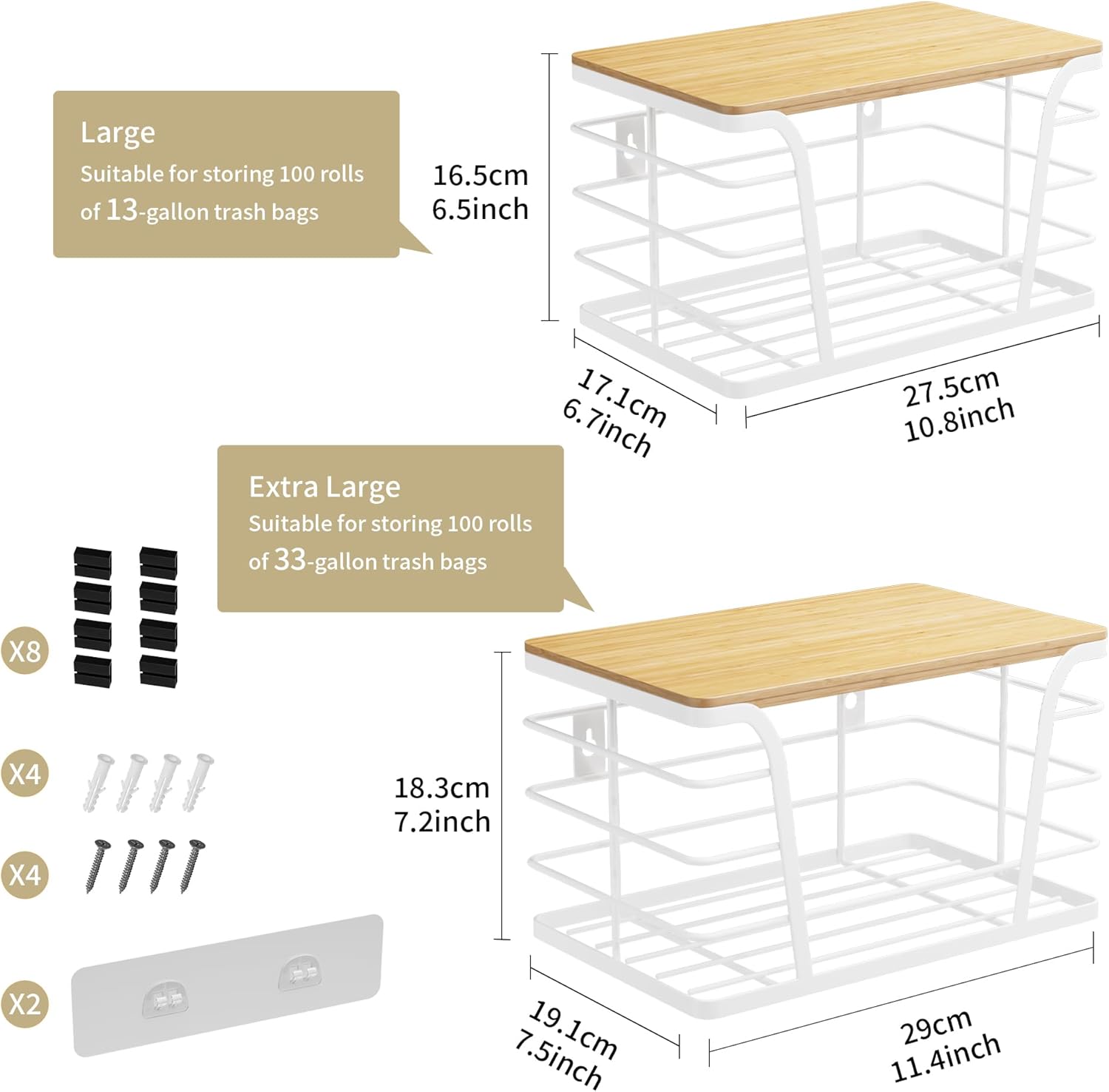 - 2 Pack Trash Bag Storage Organizer:Upgrade your kitchen storage organization with our Extra Large + Large garbage bag holder dispenser bundle! The Extra Large trash bag dispenser can hold garbage bags up to 100 rolls of 33 gallons under kitchen sink cabinets, while the Large unit organizes laundry room accessories and 100 rolls of 13 gallons trash bags