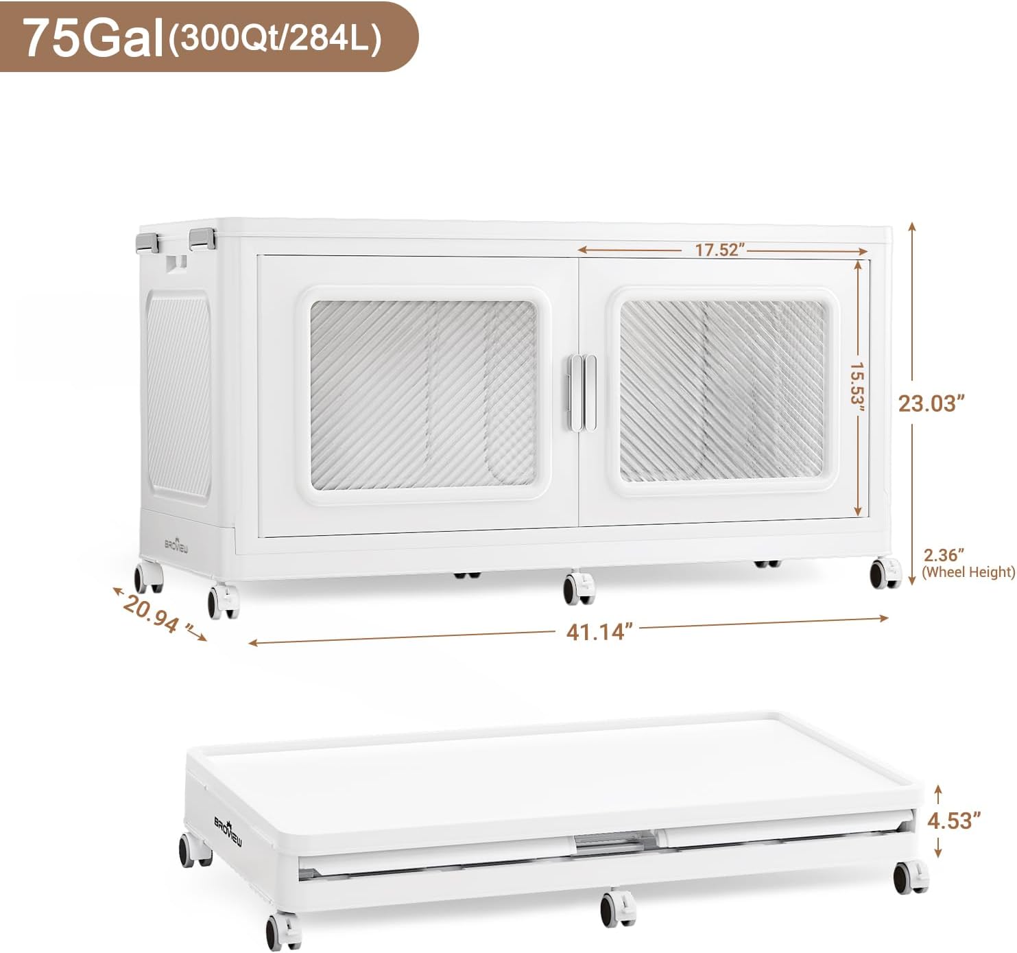 - 【Extra Large Storage Bin】75 Gal (300 QT) * 1 Pack. Dimensions: 41.14"(L) x 20.94"(W) x 22.03"(H) | Interior: 38.46"(L) x 18.82"(W) x 19.17"(H). The plastic storage bins featuring a 5.98 ft² bottom area and 1.92 ft height, ideal for maximizing large-space storage in bedrooms, garages, or closets. (Note: If you purchase multiple 300QT-1pack units separately, they cannot be stacked.)