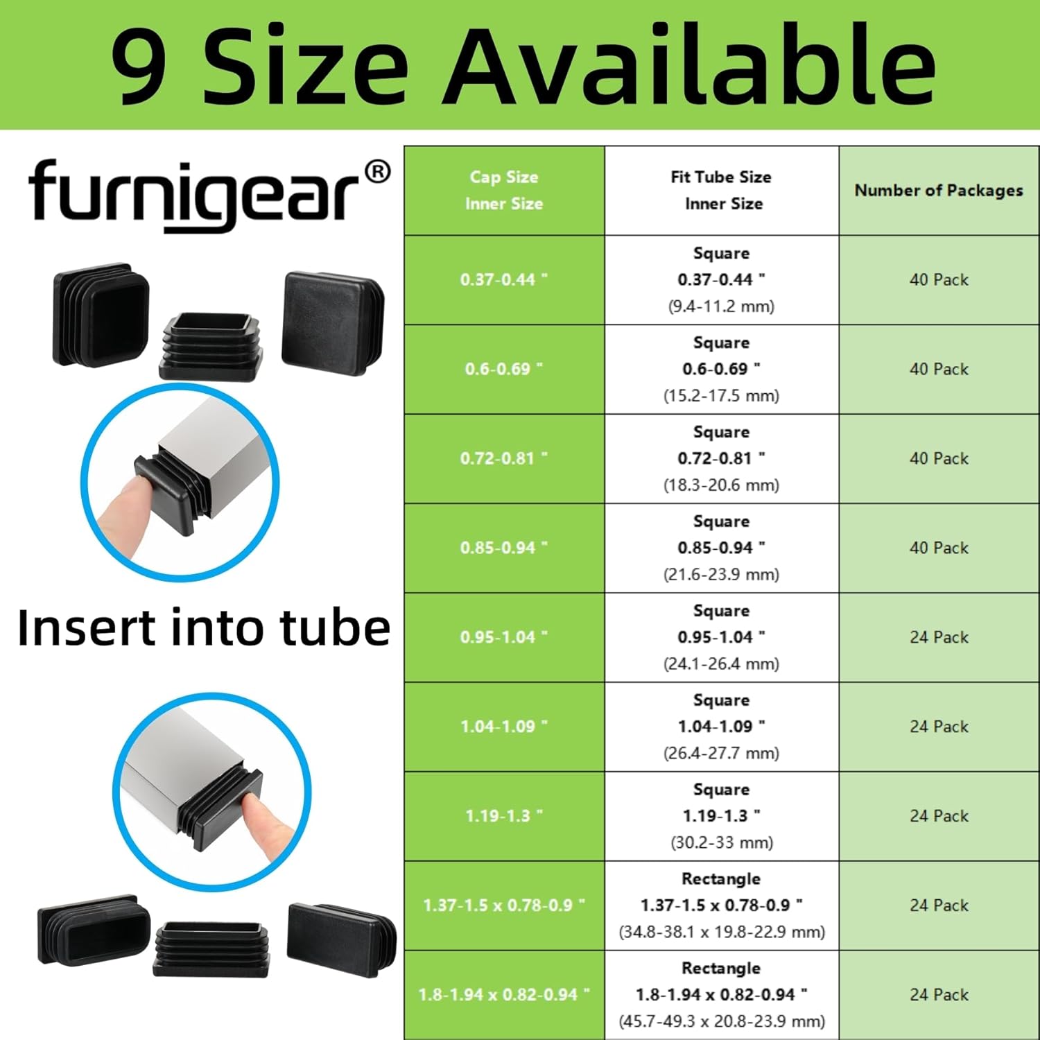 Furnigear Plastic Plugs Tubing End Cap Chair End Caps Outside Bottom Tubing Caps Square Furniture Sliders Glides Black (40, Fit 0.72-0.81" Square Tube Inner Size)