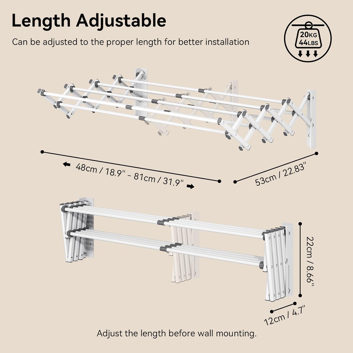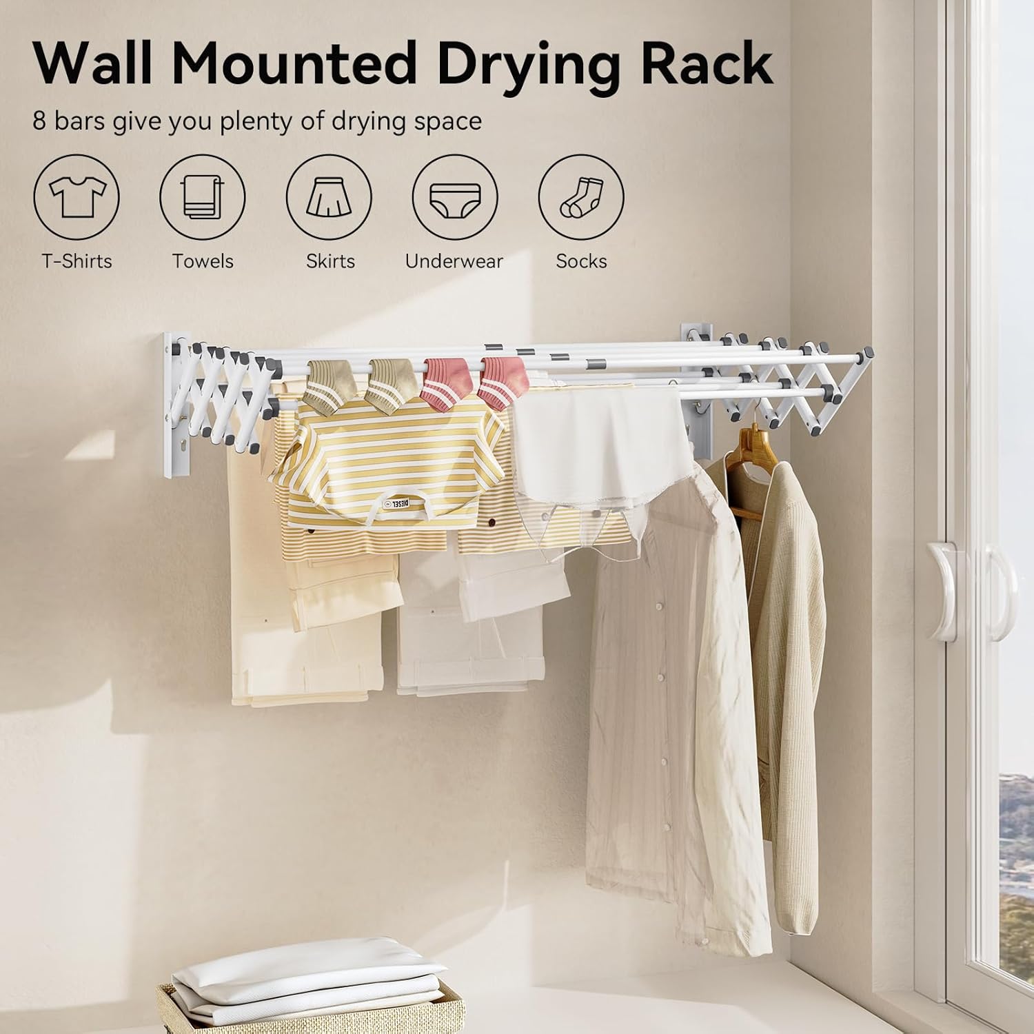 - Superior Load Capacity - The wall mounted laundry rack is made from high-quality steel. The drying rack has 8 rails which can support up to 40 lbs clothing under balanced load condition. The reinforced brackets ensure stability.