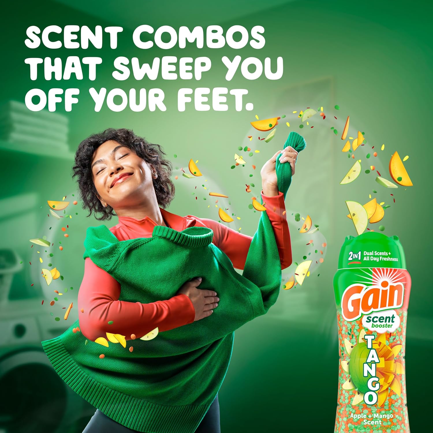 - Includes one 10.7 OZ bottle of Gain Tango Dual Scent Laundry Beads in Apple and Mango Scent
