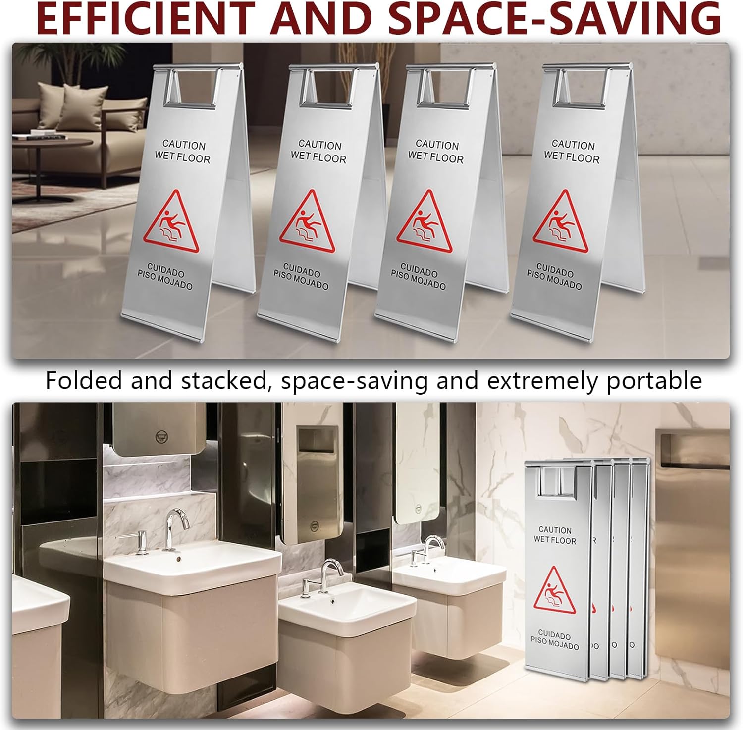 4 Pcs Stainless Steel Wet Floor Caution Sign, 24 Inch Portable Handle Bilingual Signaboard, Commercial Use Foldable Wet Floor Sign for Kitchen, Restaurant, Shop, Silver