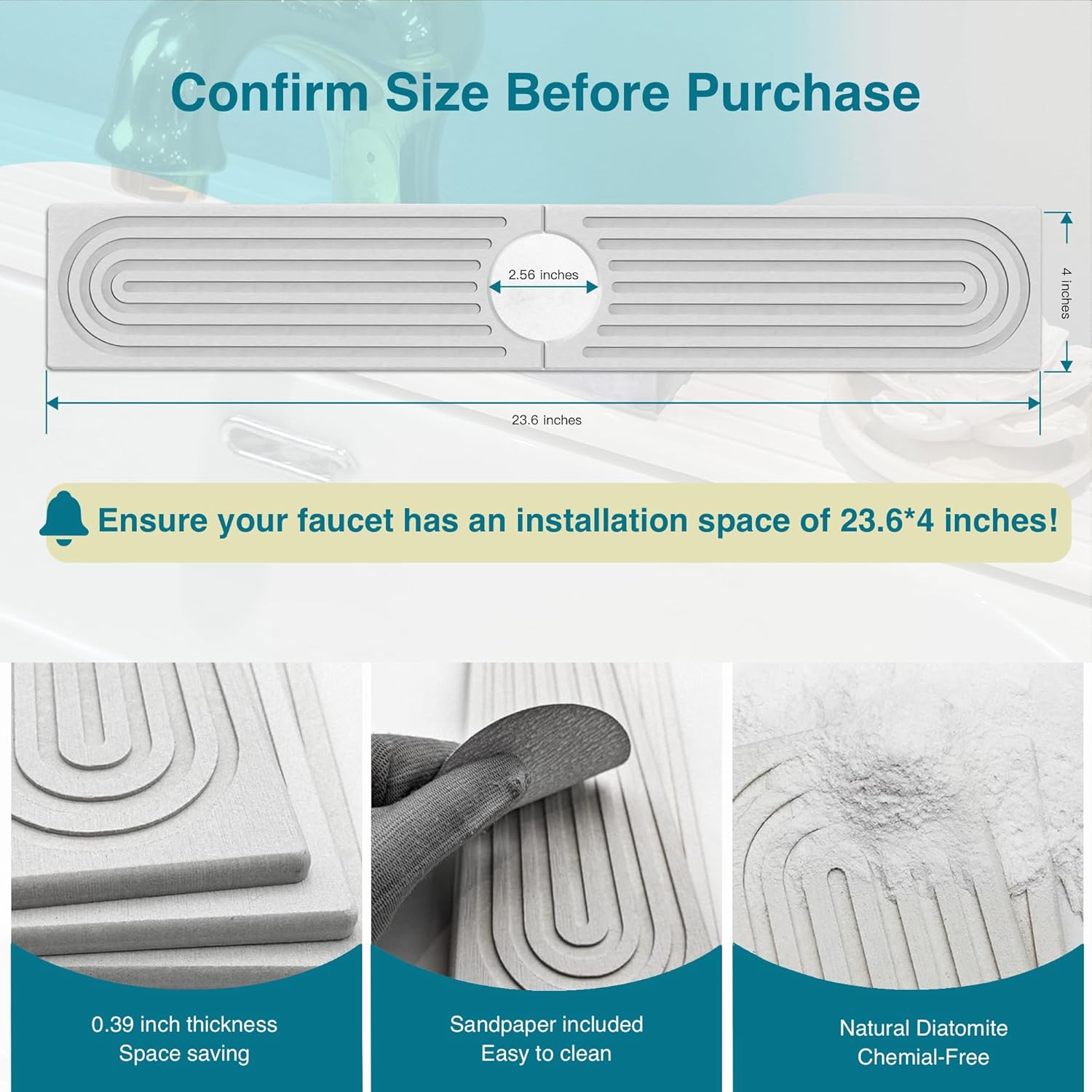- Notice: Based on the product size, make sure the stone wonβt cover any sink buttons or dispensers; Faucet-to-wall distance must be over 0.72"; Faucet base diameter must be under 2.5". | Size: 23.6" x 4" x 0.4", with a 2.56" center hole. NON-CUTTABLE HARD STONE MAT.