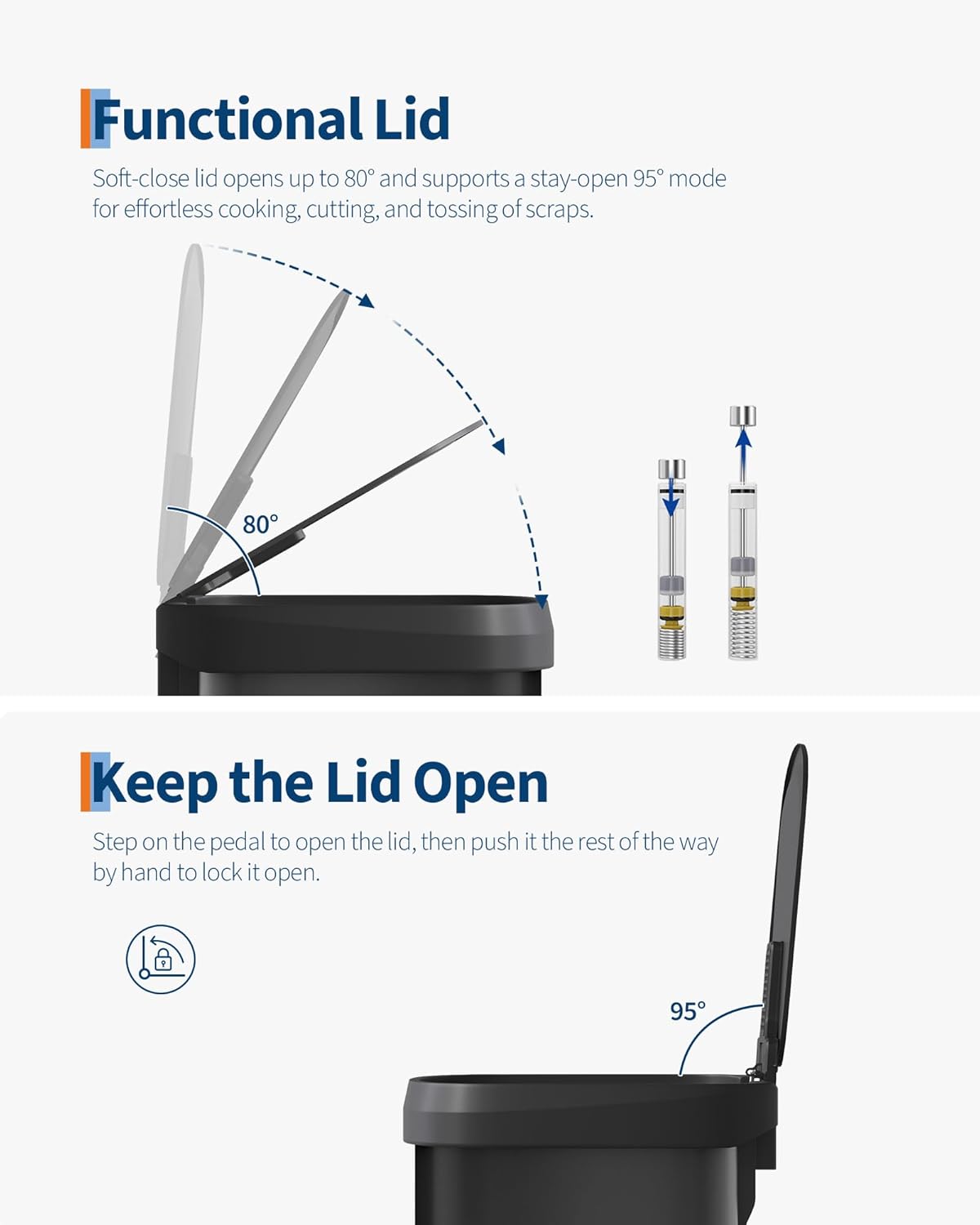 - [PRACTICAL DESIGN] – The Garvee’s tall step-on kitchen trash can prioritizes ease of use with an ergonomic rear handle for effortless lifting and relocation. The soft-close lid opens smoothly to 80° without hitting island edges and locks at 95° for hands-free cooking prep and scrap disposal. The integrated liner rim secures any standard bag snugly to prevent slips, bunching, or overhang