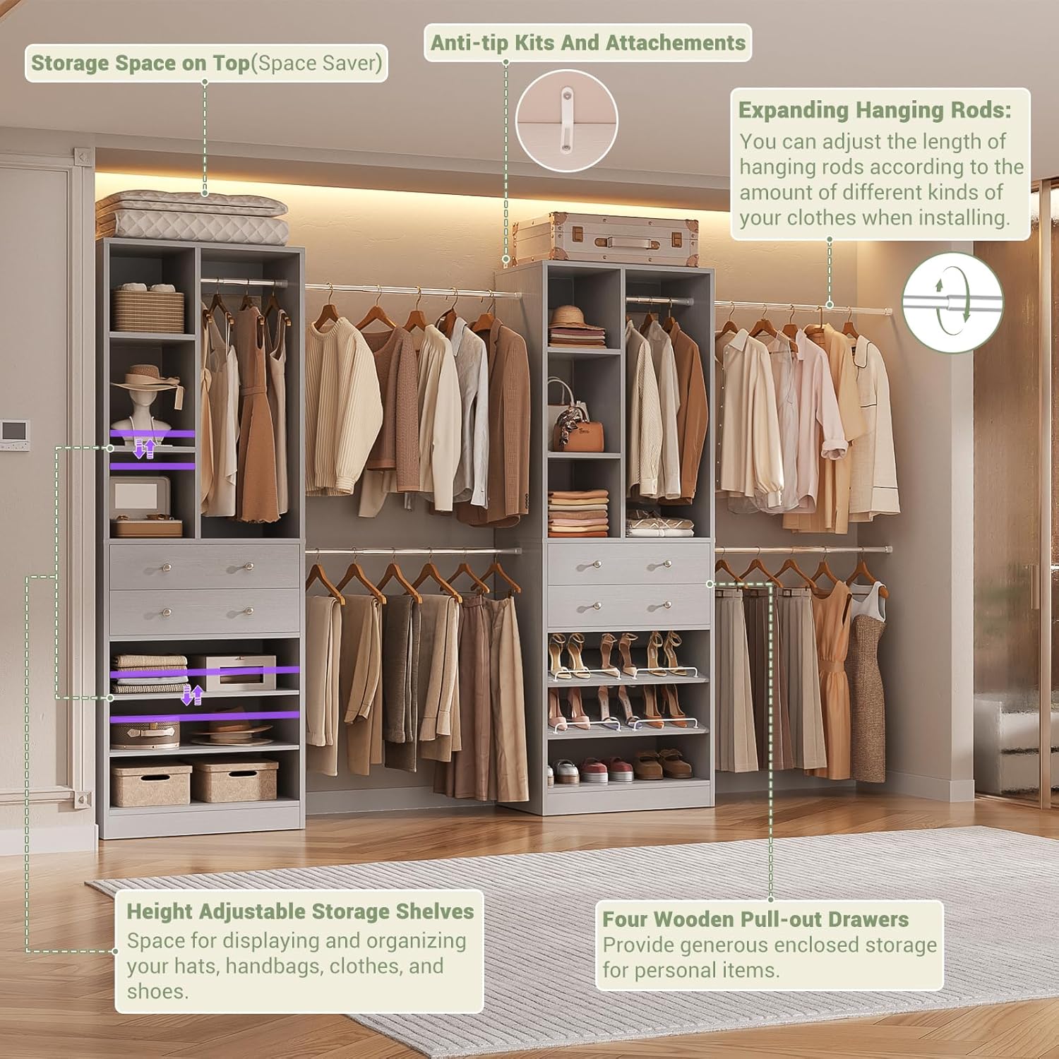 - 【Adjustable & Spacious Hanging Area】Equipped with 6 sturdy expandable hanging rods, this closet system offers ample space to organize your clothes. The rod length is adjustable, allowing for a flexible fit in closet spaces ranging from 77.6" to 134.4", making it perfect for various room sizes