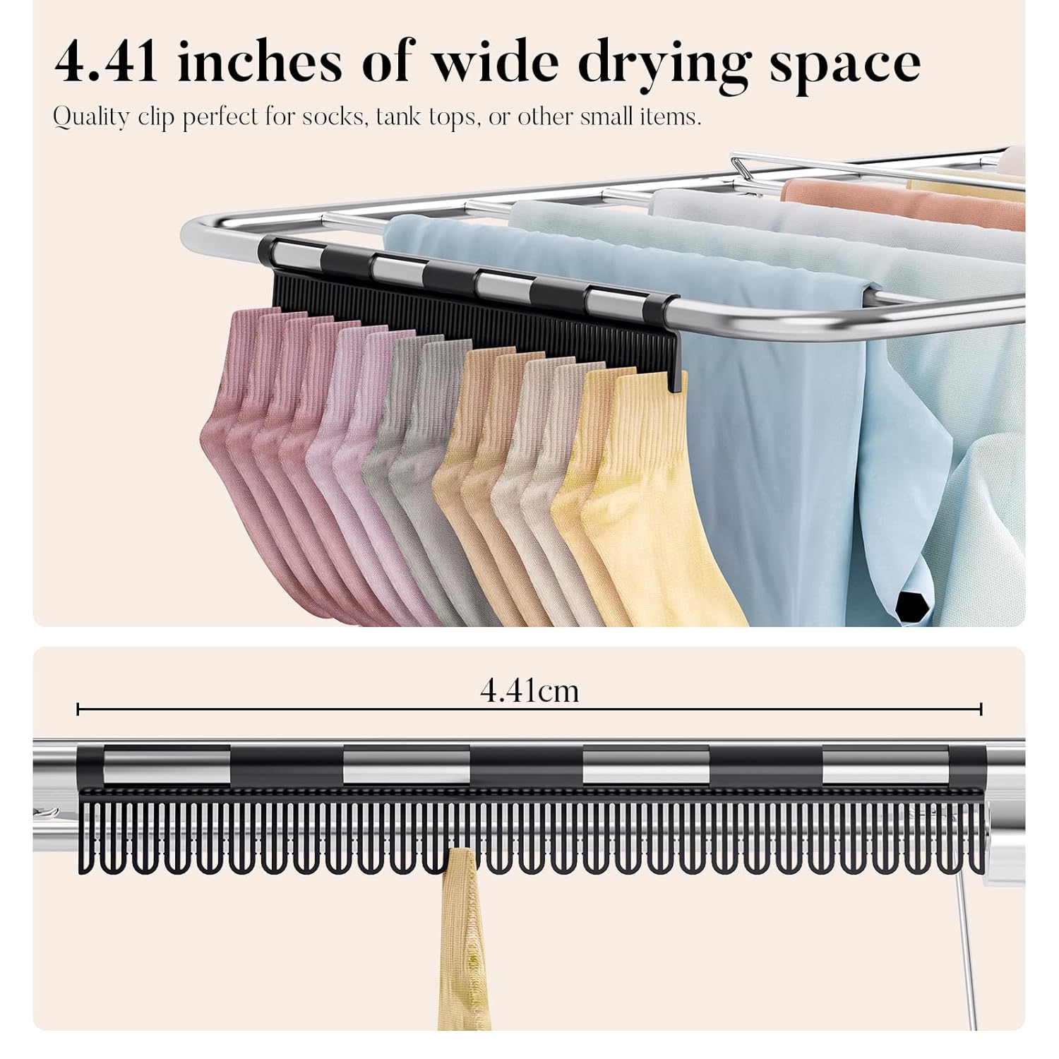 - Large Capacity with Sock Clips: When you unfold this drying rack, it has 4 wings and 2 layers of drying space—upper and lower. It comes with sock clips that can hold up to 28 pairs of socks. The fully expanded dimensions are: 58.86" L x 43.34" H x 22.05" W. The big capacity makes drying stuff way easier.