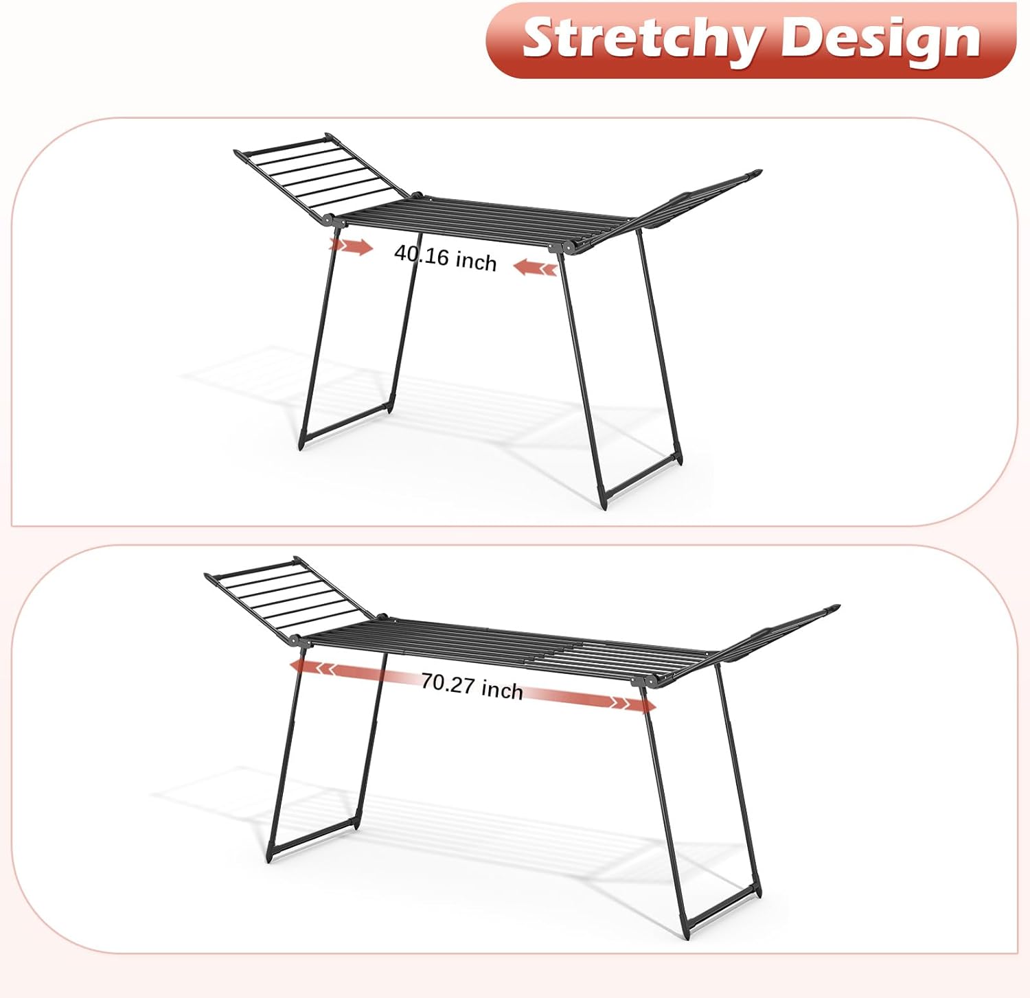- Stretches Both Ways: Unfold the drying rack first, then stretch it further left and right. Since it's long, use the side "wings" to pull it. Unstretched size: 70.47" x 39.09" x 21.93". Stretched size: 21.9"W x 100"L x 39"H