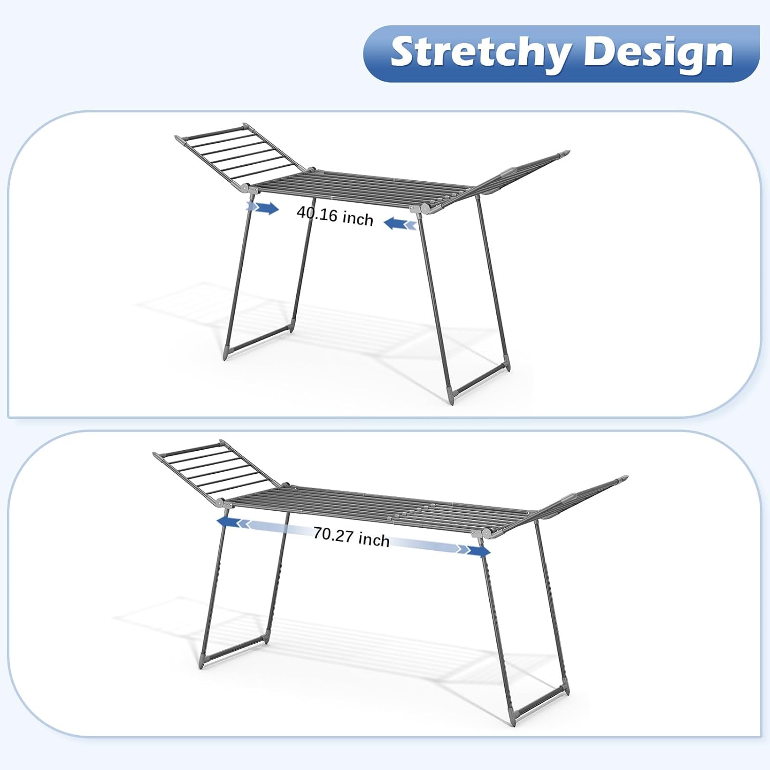- Stretches Both Ways: Unfold the drying rack first, then stretch it further left and right. Since it's long, use the side "wings" to pull it. Unstretched size: 70.47" x 39.09" x 21.93". Stretched size: 21.9"W x 100"L x 39"H
