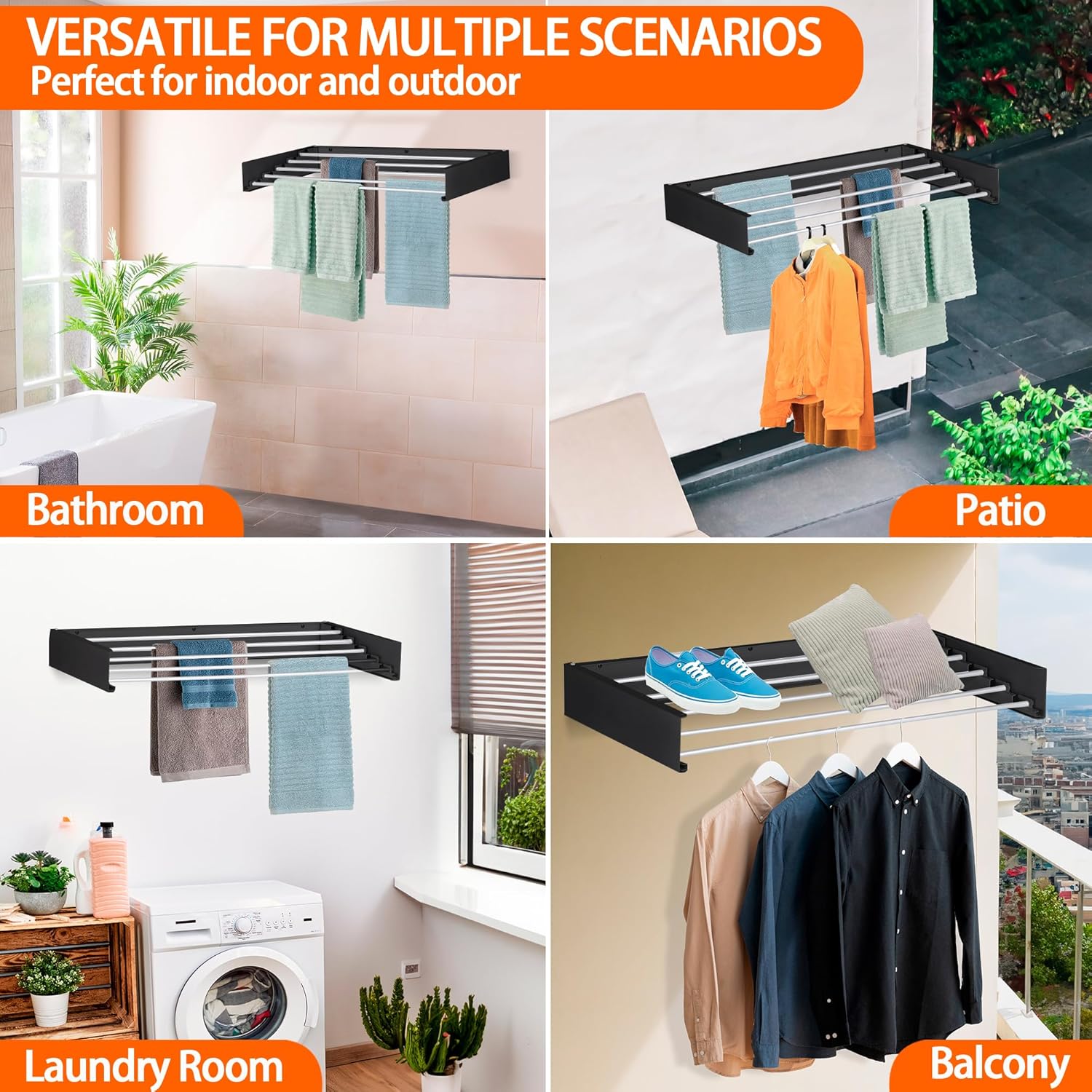 - Wide Applications - This multifunctional clothes hanger is perfect for indoors and outdoors, whether in the bathroom, kitchen, laundry room, garage, hotel, dormitory, patio, swimming pool, or balcony, it can be used all year round, making your drying journey worry-free