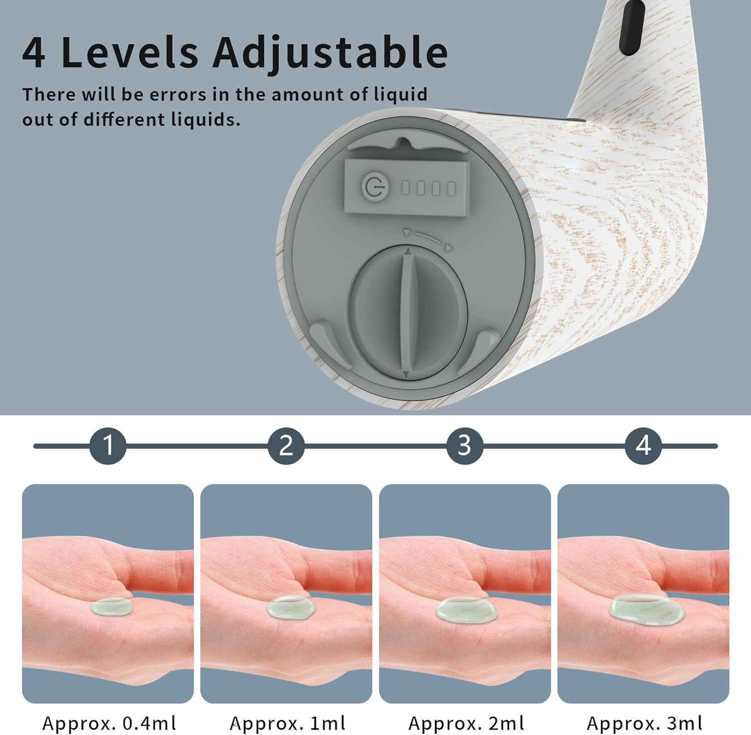 - 【Smart 4-Level Dispensing】This countertop soap dispenser offers 4 precision settings (0.4ml-3ml) - ideal for thick dish soap or light hand sanitizer. The kitchen dish soap dispenser helps reduce liquid waste while providing appropriate portions every time.