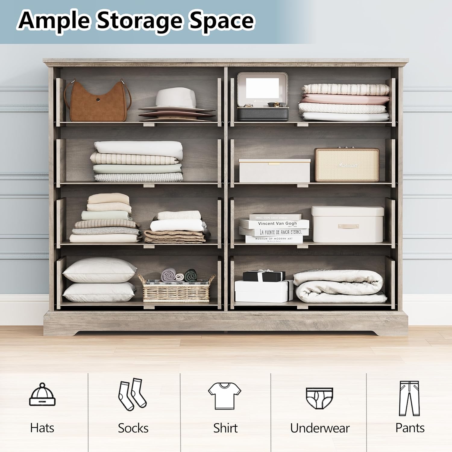 • Timeless, Refined Design: This 8-drawer farmhouse dresser for the bedroom features clean, contemporary lines with a natural wood grain texture that brings warmth and character to any room. The antique bronze metal handles add vintage charm, creating a perfect balance of traditional and modern design. Whether used as a modern dresser, a storage dresser, a bedroom dresser, or a tall dresser for closet, this piece serves as both a functional storage solution and a stylish focal point in your space.