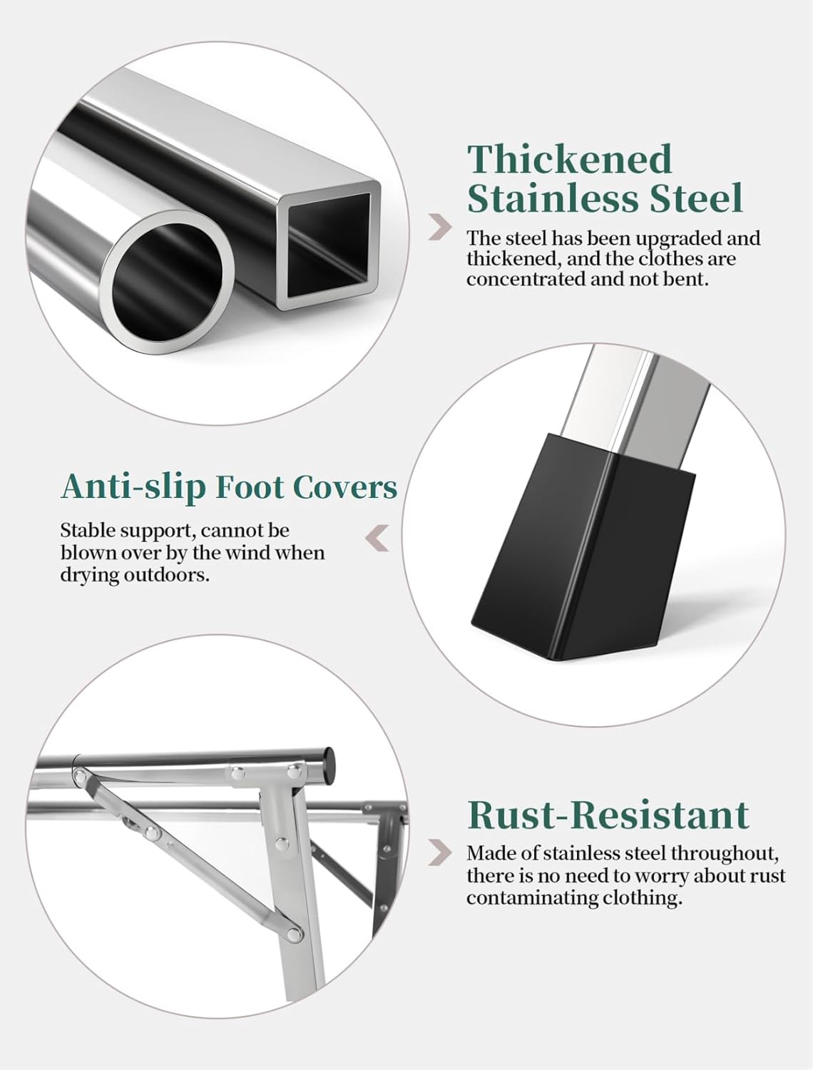 - 👕Quality Upgrade, Exquisite Details: This drying rack has been made of thickened stainless steel, which is durable and features a smooth and edge - free surface to prevent clothes from being scratched. The non - slip foot pads at the bottom can effectively protect the floor and ensure quiet movement, demonstrating excellent quality and reliability in every detail.