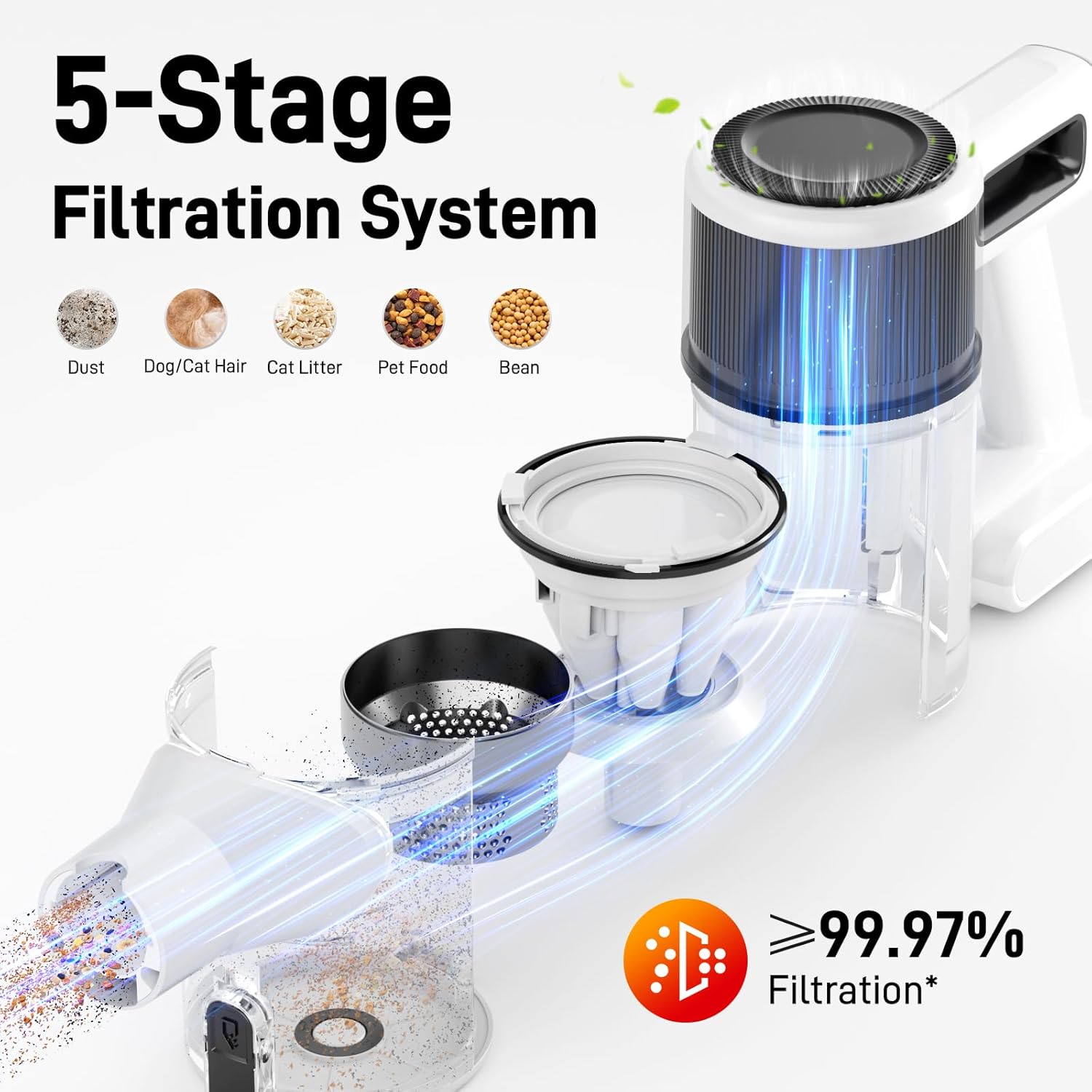- 🍃【Adv-Filtration System】Stick vacuum cordless rechargeable features a fully sealed cyclone filtration system with a HEPA filter, stainless steel filter, and sponge filters, capturing up to 99.99% of fine dust particles as small as 0.1 microns. It effectively prevents secondary pollution and ensures clean, fresh air.