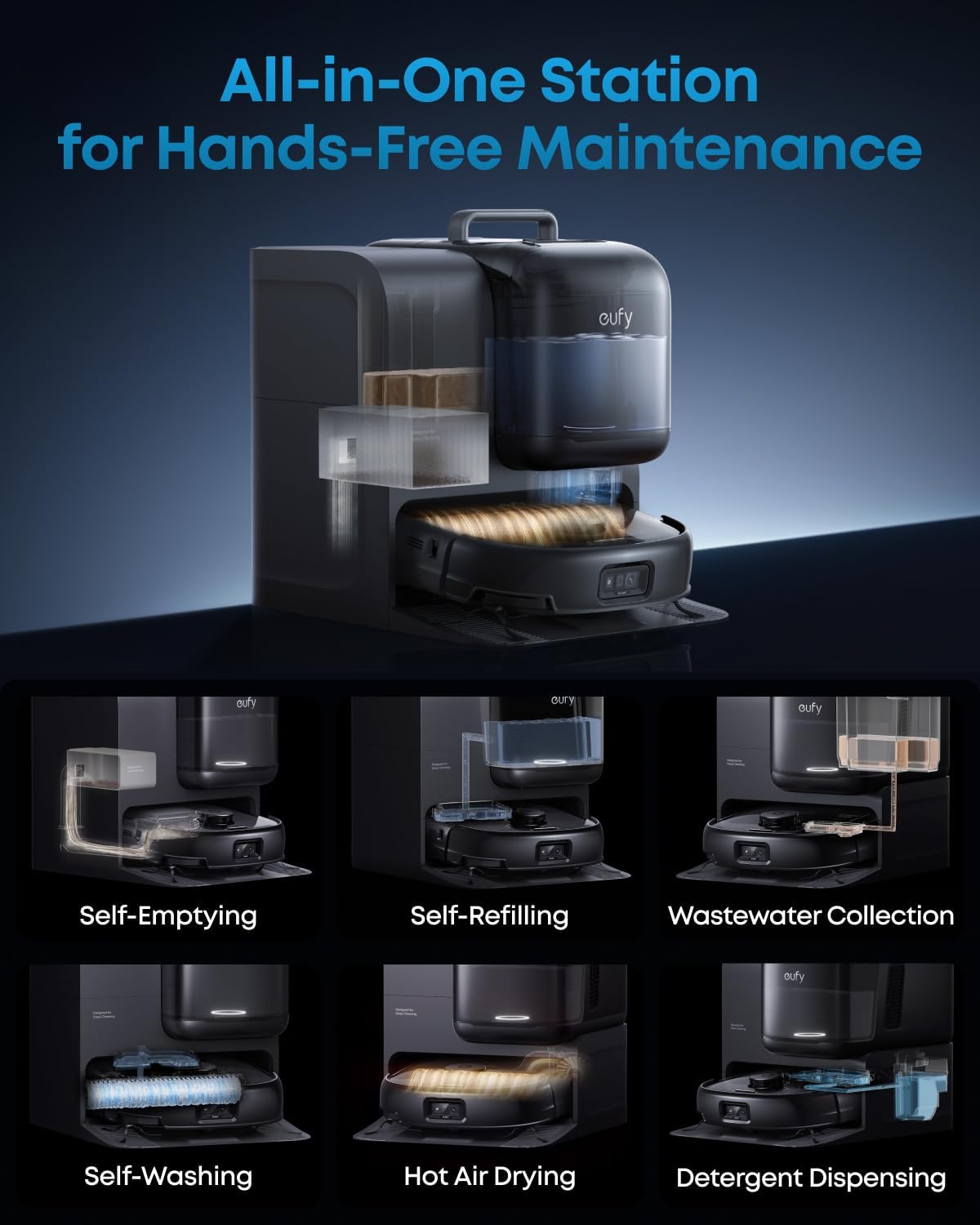 - All-in-One Station: Streamlines daily cleaning with self-emptying, self-washing, self-refilling, hot air drying, automatic detergent dispensing, and wastewater storage.