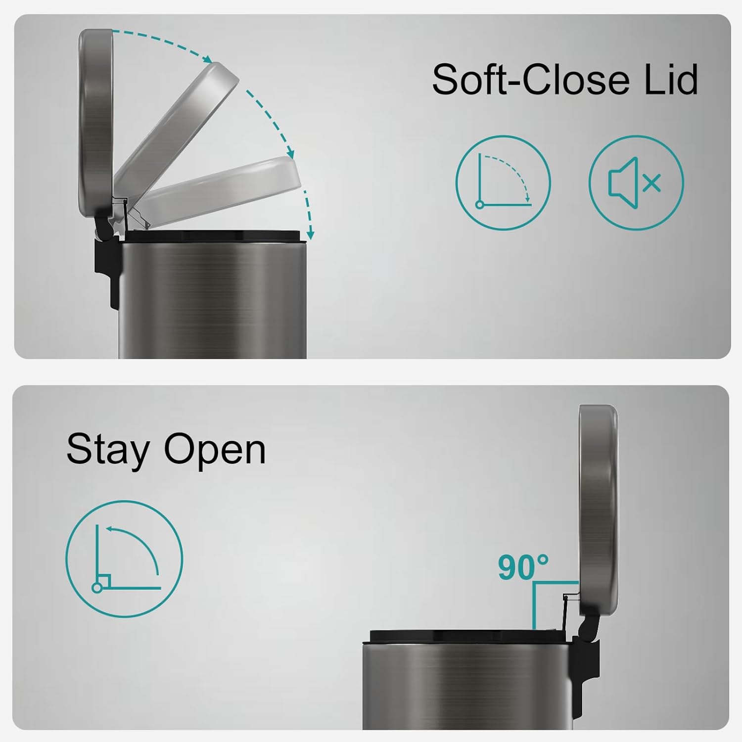 - 【 Silent-Close Lid】No more loud slams! The whisper-quiet, soft-closing lid is perfect for kitchens or offices. It stays open at 90° for hands-free use and locks odors inside.