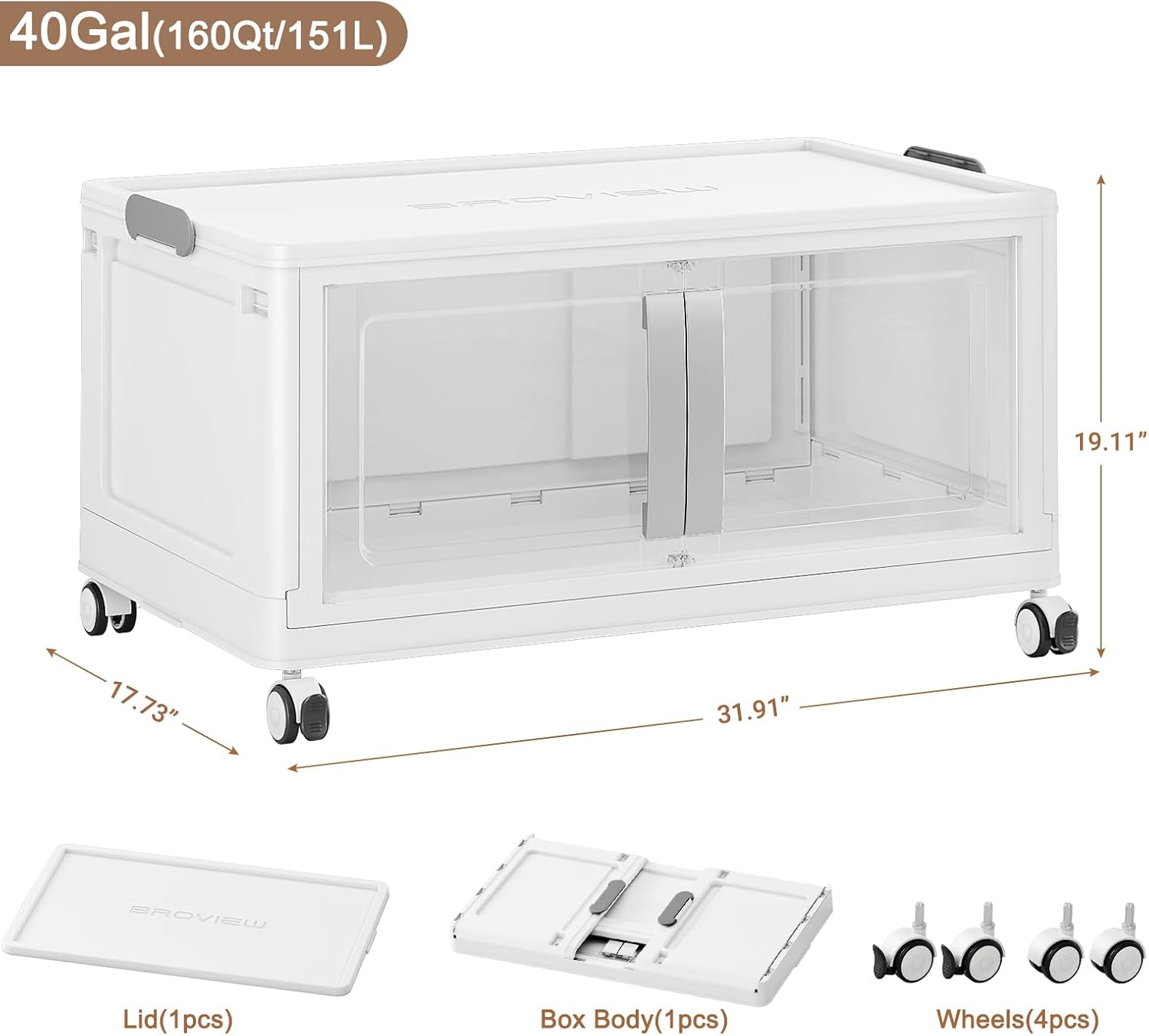 BROVIEW 160QT Stackable Storage Bins with Lids, 40Gal Extra Large Collapsible Storage Box with Wheel, Plastic Storages with Clear Door Open Front for Home Kitchen Garage, White-1pack(1 lid)