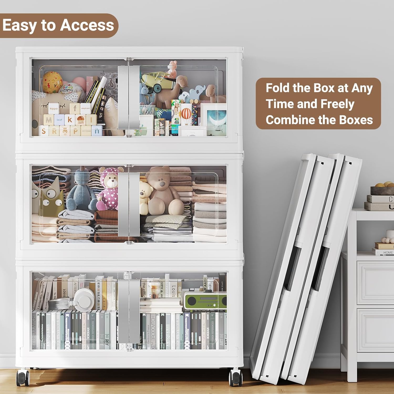 - 【Super Clear Doors & Ease Access】Stackable storage bins with doors open front features super clear PET doors for instant content viewing at a glance. Enjoy effortless one-handed access with the oversized ergonomic handle and secure magnetic closure. Sleek and modern folding storage bins with lids seamlessly complements any contemporary home decor