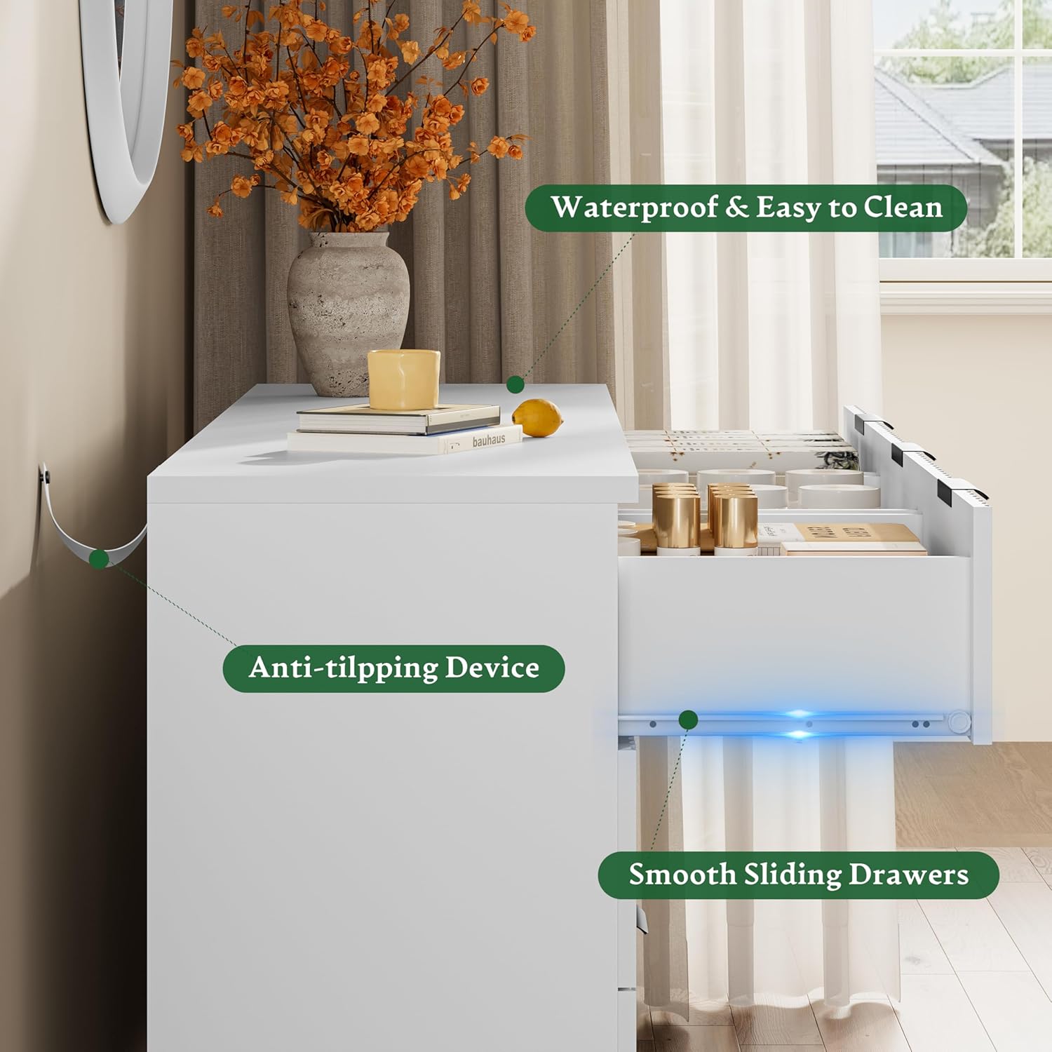 - 【Stability & Safety】The white/black/oak/grey dresser is equipped with an anti-tipping device, which can be fixed on the wall to prevent accidents. Each drawer contains a wide metal handle and built-in slide rail, easy to push and pull. Besides, the sturdy base provides this dresser with drawers a strong support and the middle feet can be adjustable to keep balance on uneven floors