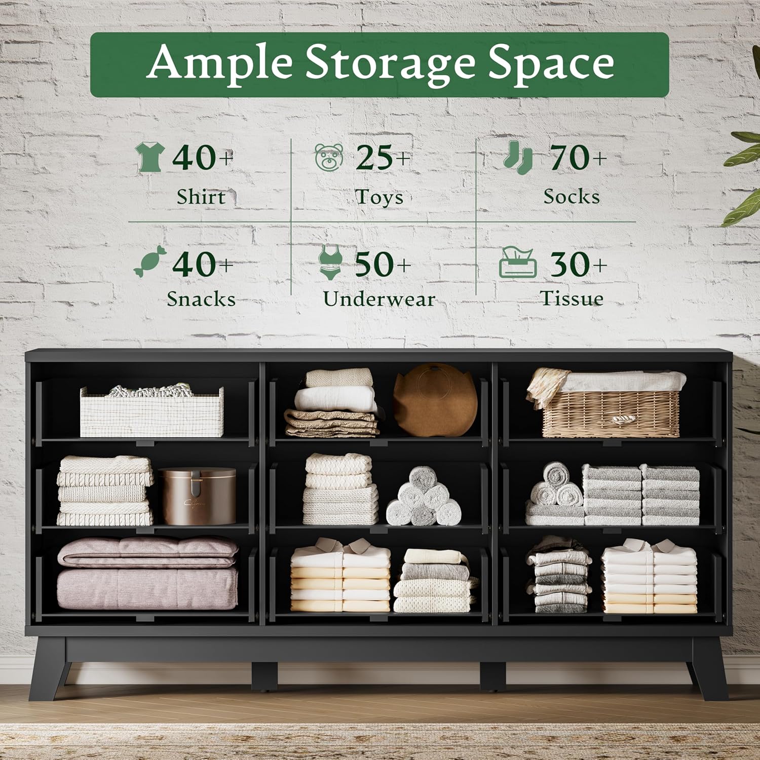 Fluted Dresser with 9 Drawers, 63" Wide Modern Chest of Drawers with Metal Handle, Wooden Dresser TV Stand, Wood Closet Clothes Storage Organizer for Bedroom, Living Room, Hallway, Solid Black
