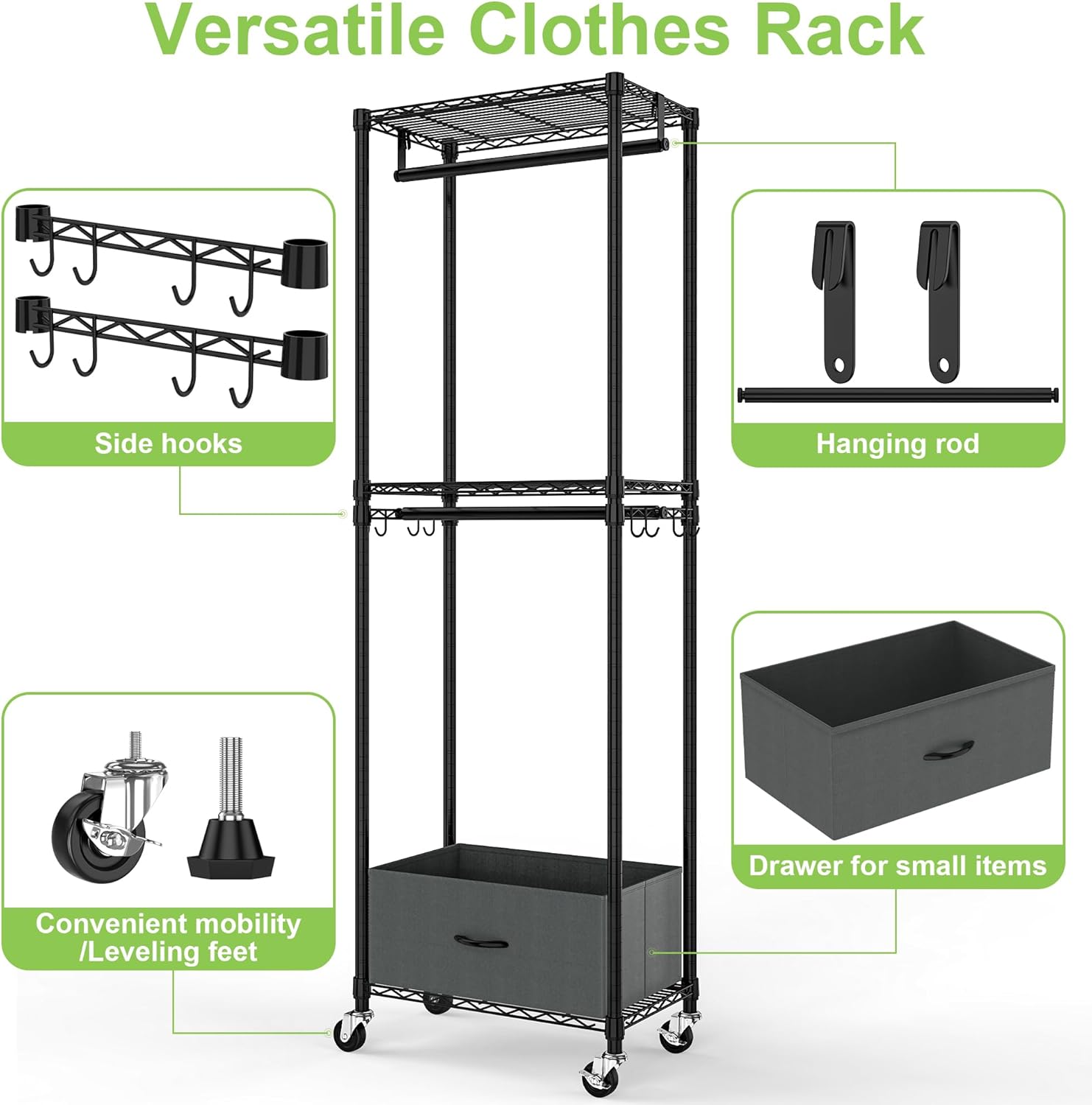 Clothes Rack with Drawers, Freestanding Rolling Garment Rack for Hanging Clothes, Closet Organizer Adjustable Metal Wire Shelving Wardrobe with Rods Portable Closet Shelf with Wheels, Black