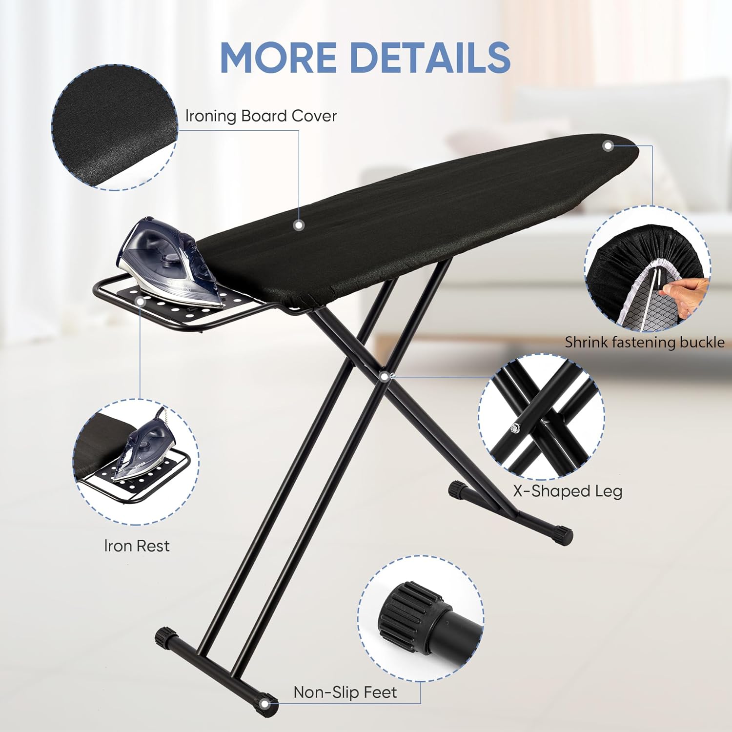 Full Size Ironing Board 47" X 15" with Heat Resistant Cover and Thicken Felt Pad, Safety Iron Rest, Anti-Skid Feet, Height Adjustable, Heavy Duty,Black