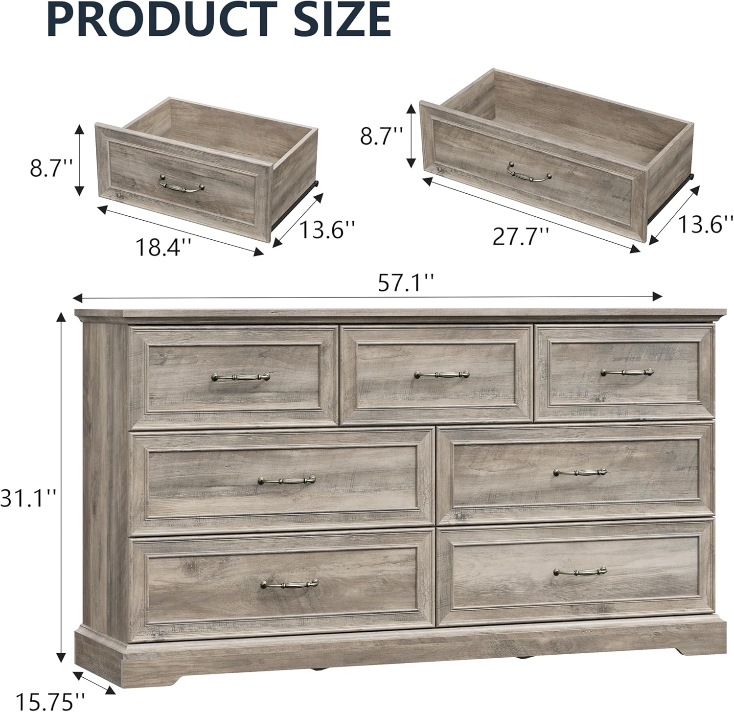 - Timeless, Refined Design: This 7-drawer farmhouse dresser combines clean, contemporary lines with a sophisticated finish, bringing both elegance and character to your home. Antique bronze metal handles add a touch of vintage charm, creating the perfect blend of modern and traditional design. Whether used as a bedroom dresser, tall dresser for closet, storage cabinet, or even a TV stand, this piece is both a stylish focal point and a practical storage solution.