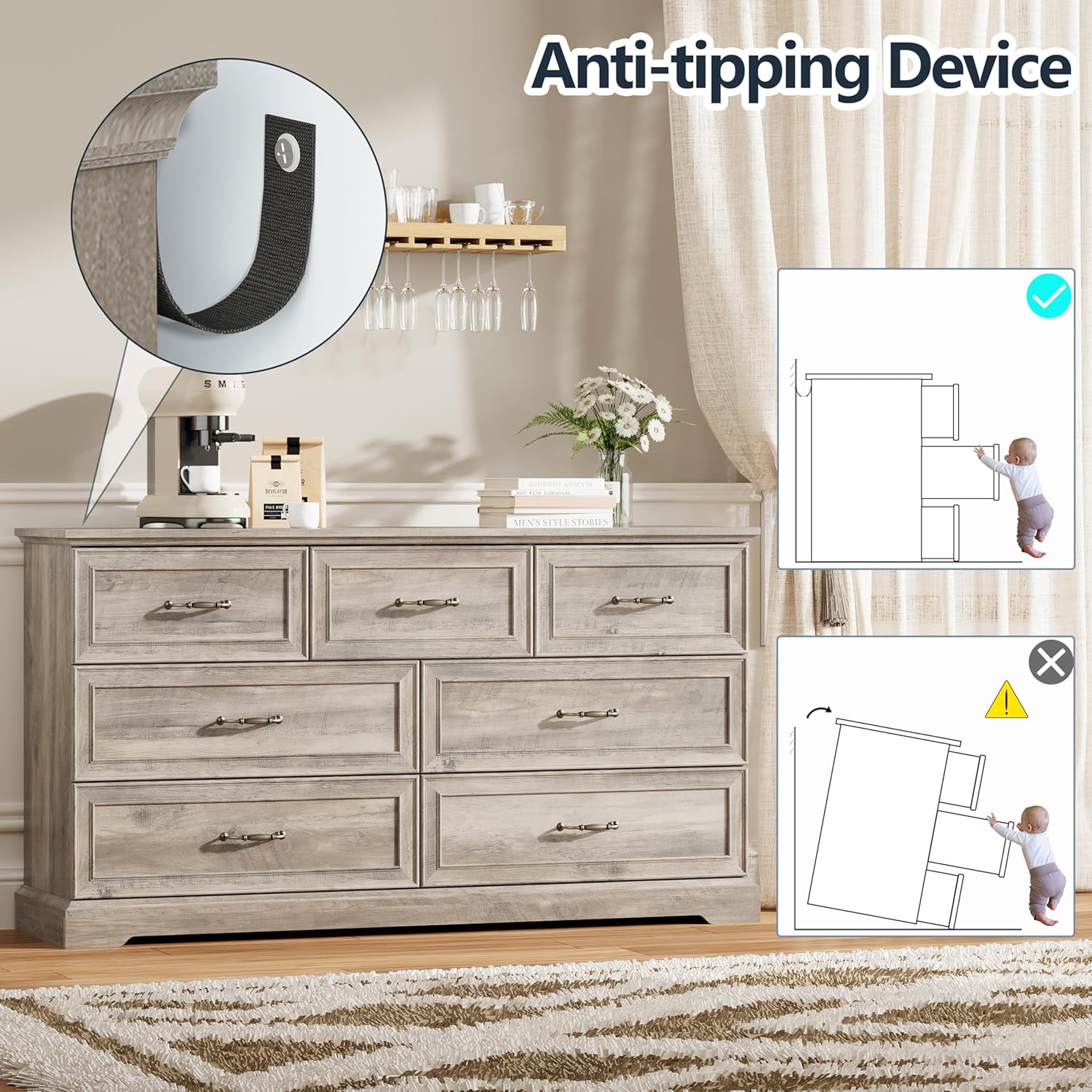 - Durable & Stable Construction: Crafted from premium engineered wood, this sturdy dresser is designed for long-lasting durability. It features solid 3.5-inch legs and a 1.2" thick top surface that supports up to 180 lbs—ideal for displaying a TV, decor, or other items. Smooth metal drawer slides ensure effortless opening and closing, while the built-in anti-tip device provides extra safety and stability, making it reliable for any home.